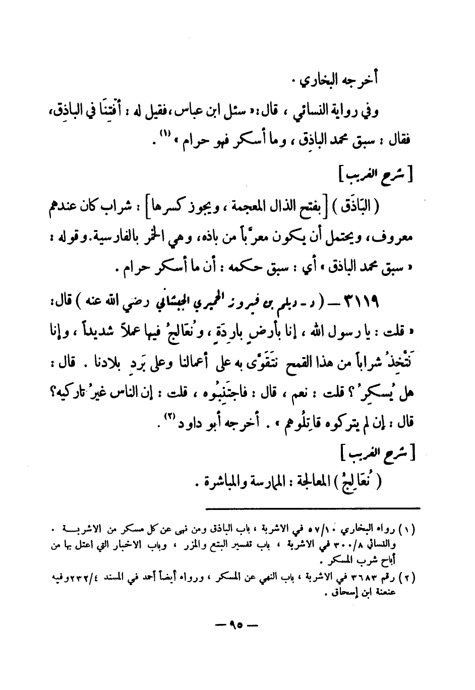 3119 - (د) ديلم بن فيروز الحميري الجبشاني - رضي الله عنه - قال: «قلت: يا رسول الله، إنا بأرض بارِدة، ونُعالجُ فيها عملاً شديداً، وإنا نتَّخِذُ شراباً من هذا القمح نتقَوَّى به على أعمالنا وعلى بردِ بلادنا. قال هل يُسكِرُ؟ قلت: نعم، قال: فاجتَنِبُوه، قلت: إن الناس غيرُ تاركيه قال: إن لم يتركوه قاتِلُوهم» . أخرجه أبو داود (¬1) .