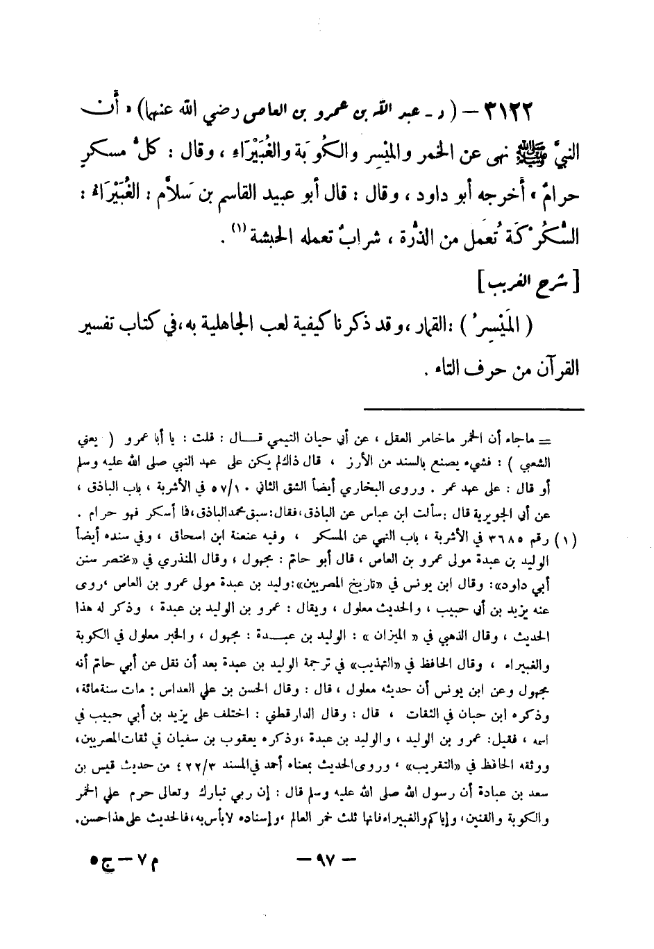 3122 - (د) عبد الله بن عمرو بن العاص رضي الله عنهما - «أن النبيَّ - صلى الله عليه وسلم- نهى عن الخمر والميْسِر والكُوبَة والغُبَيْرَاءِ، وقال: كلُّ مسكر حرام» أَخرجه أبو داود، وقال قال أبوعبيد القاسم بن سَلام: الغُبَيْرَاءُ: السُّكُرْكَةُ تعمل من الذُّرة، شراب تعمله الحبشة (¬1) .