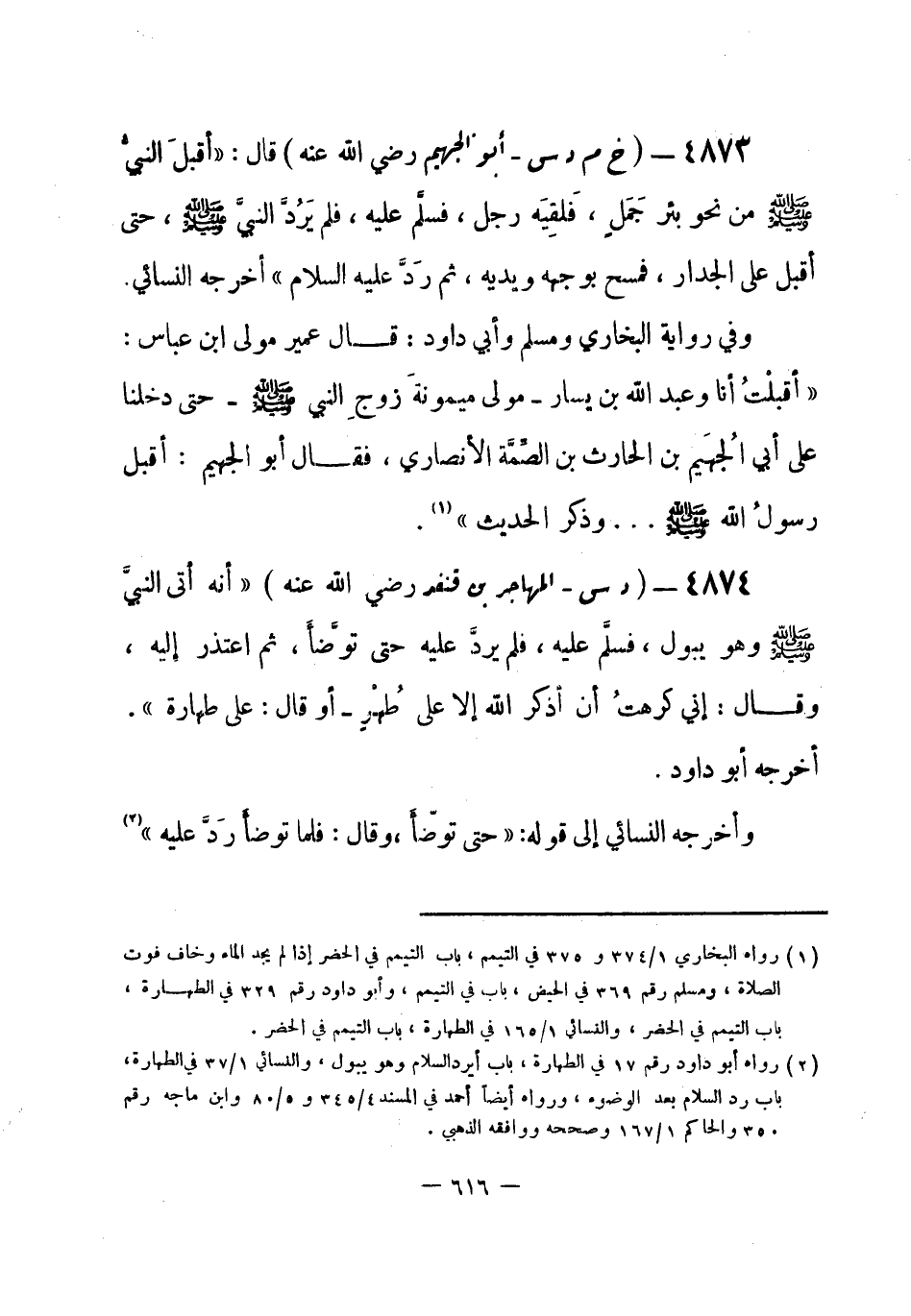 4873 - (خ م د س) أبو الجهيم - رضي الله عنه- قال: «أقبلَ النبيُّ - صلى الله عليه وسلم- من نحو بئر جَمَل، فَلقِيَه رجل، فسلَّم عليه، فلم يَرُدَّ النبيَّ - صلى الله عليه وسلم-، حتى أقبل على الجدار، فمسح بوجهه ويديه، ثم رَدَّ عليه السلام» أخرجه النسائي