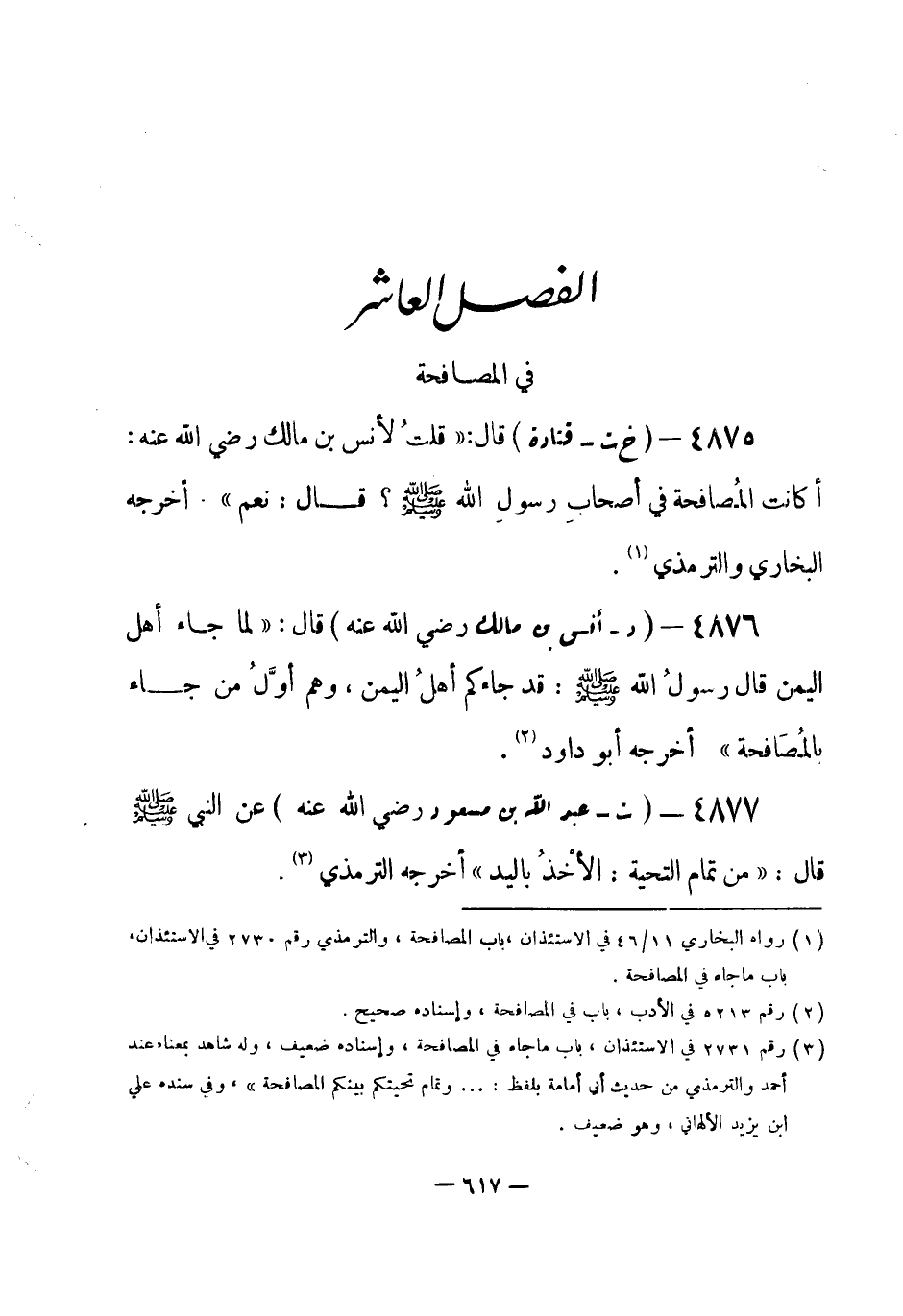 4877 - (ت) عبد الله بن مسعود - رضي الله عنه- عن النبي - صلى الله عليه وسلم- قال: «من تمام التحية: الأخْذُ باليد» أخرجه الترمذي (¬1) .