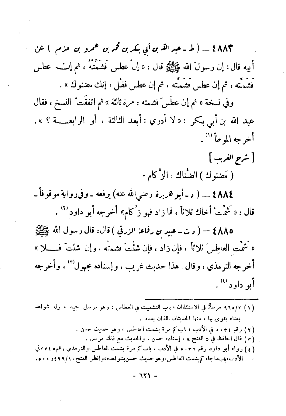 4884 - (د) أبو هريرة -رضي الله عنه- يرفعه - وفي رواية موقوفاً - قال: «شَمِّتْ أخاك ثلاثاً، فما زاد فهو زُكام» أخرجه أبو داود (¬1) .