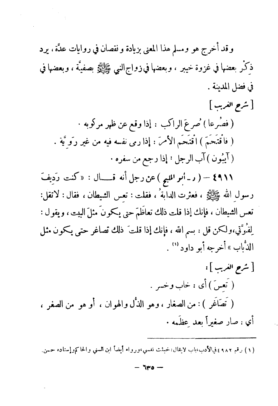 4911 - (د) أبو المليح عن رجل أنه قال: «كنت رَدِيفَ رسولِ الله - صلى الله عليه وسلم-، فعثرت الدابةُ، فقلت: تعس الشيطان، فقال: لا تقل: تعس الشيطان، فإنك إذا قلت ذلك تعاظَمَ حتى يكونَ مثلَ البيت، ويقول: لِقُوَّتي، ولكن قل: بسم الله، فإنك إذا قلتَ ذلك تصاغر حتى يكون مثل الذُّباب» أخرجه أبو داود (¬1) .
