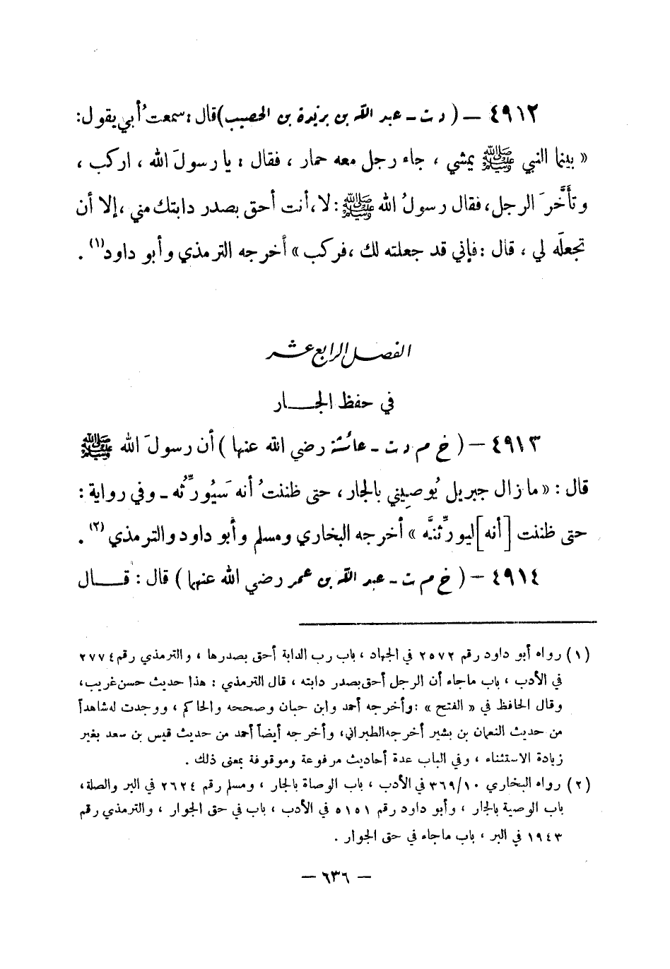 4913 - (خ م د ت) عائشة - رضي الله عنها- أن رسولَ الله - صلى الله عليه وسلم- قال: «ما زال جبريل يُوصيِني بالجار، حتى ظننتُ أنه سيُوَّرِّثُه - وفي رواية: حتى ظننت [أنه] ليورِّثنَّه» أخرجه البخاري ومسلم وأبو داود والترمذي (¬1) .