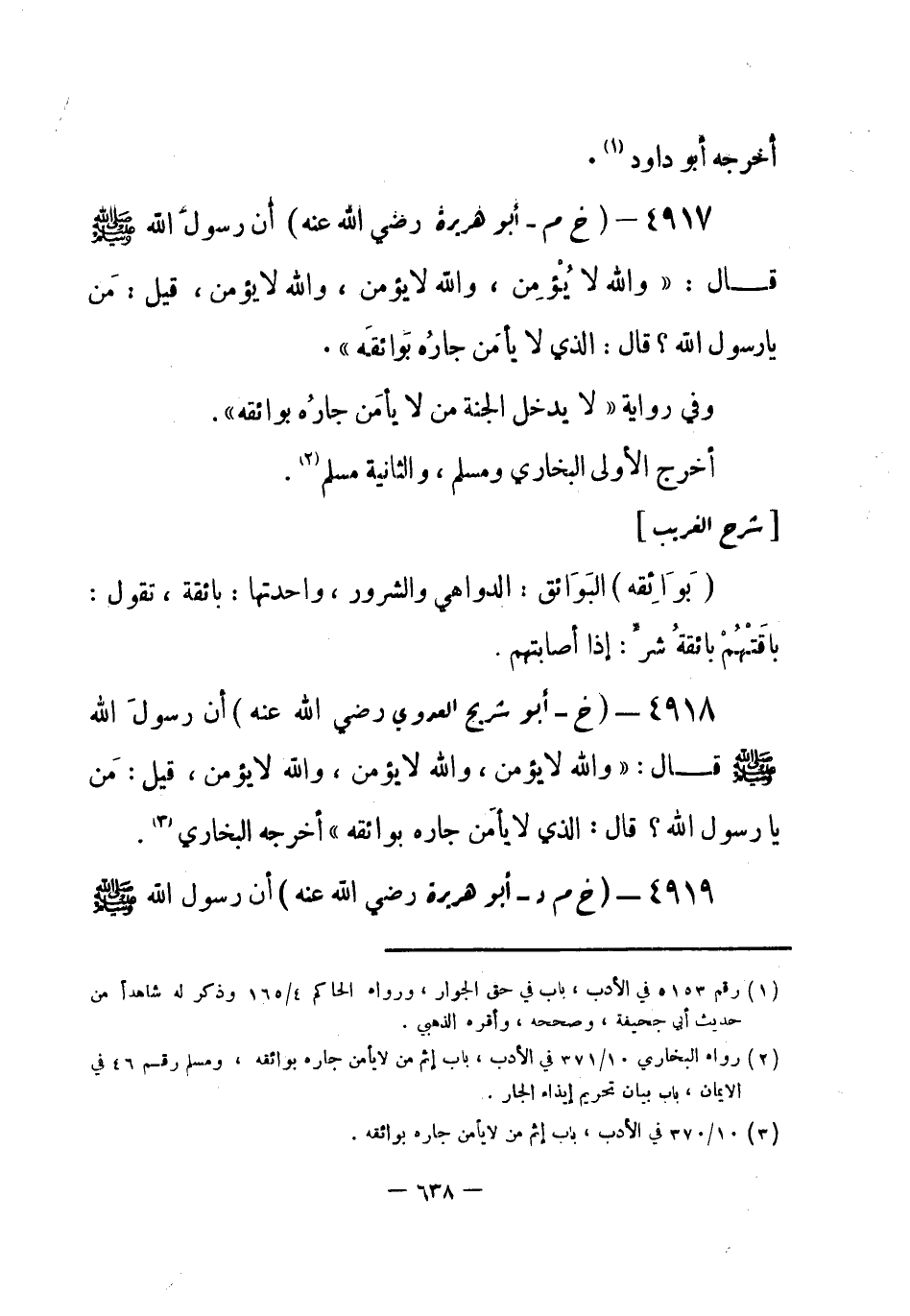 4917 - (خ م) أبو هريرة - رضي الله عنه -: أَنَّ رسولَ اللهِ - صلى الله عليه وسلم- قال: «واللهِ لا يُؤْمِن، والله لا يؤمن، والله لا يؤمن، قيل: مَن يا رسول الله؟ قال: الذي لا يأمَن جارُه بَوائِقَهُ» .