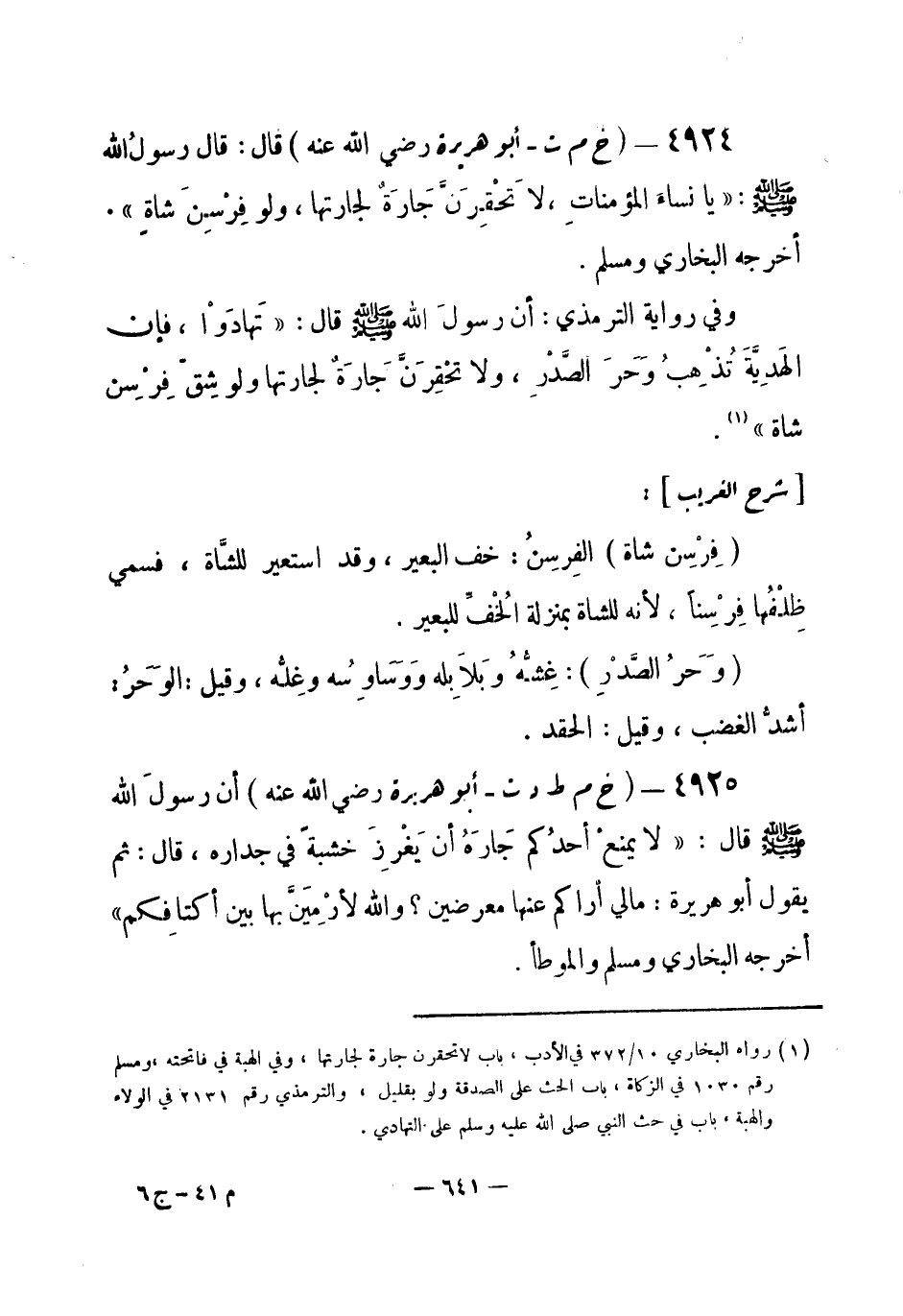 4924 - (خ م ت) أبو هريرة - رضي الله عنه -: قال: قال رسول الله - صلى الله عليه وسلم-: «يا نساءَ المؤمناتِ، لا تَحْقِرنَّ جَارَة لجارتها، ولو فِرْسِنَ شَاة» .