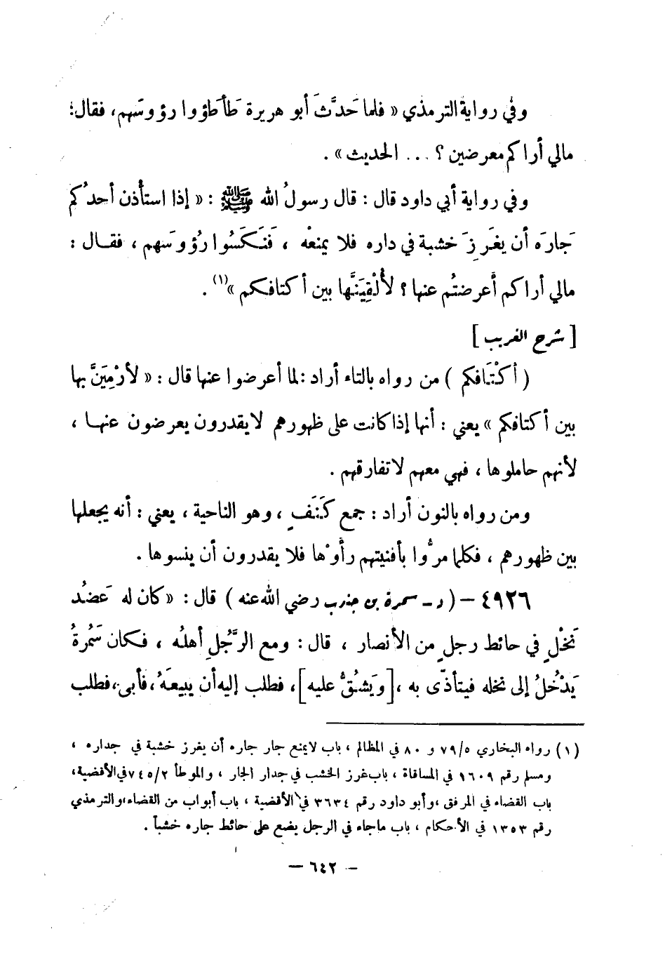 4926 - (د) سمرة بن جندب - رضي الله عنه -: قال: «كان له عَضُد نَخْل في حائط رجل من الأنصار، قال: ومع الرَّجُلِ أهلُه، فكان سَمُرَةُ يَدْخُلُ إِلى نخله فيتأذّى به، [وَيشُقُّ عليه] ، فطلب إِليه أن يبيعَهُ، فأبى، فطلب -[643]- إليه أن يُناقِلهُ، فأبى، فأتى صاحبُ الحائط رسولَ الله - صلى الله عليه وسلم-، فذكر ذلك له، فطلبَ إِليه رسولُ الله - صلى الله عليه وسلم- أن يبيعَهُ، فأبى، فطلب إِليه أن يُناقِلَهُ، فأبى، فقال: فَهَبْهُ له، ولك كذا وكذا أجراً، أمراً رَغَّبهُ فيه، فأبى، فقال: أنت مُضَارّ، وقال رسولُ الله - صلى الله عليه وسلم- للأَنصاريِّ: اذهب فاقلعْ نَخْلَهُ» . أخرجه أبو داود (¬1) .