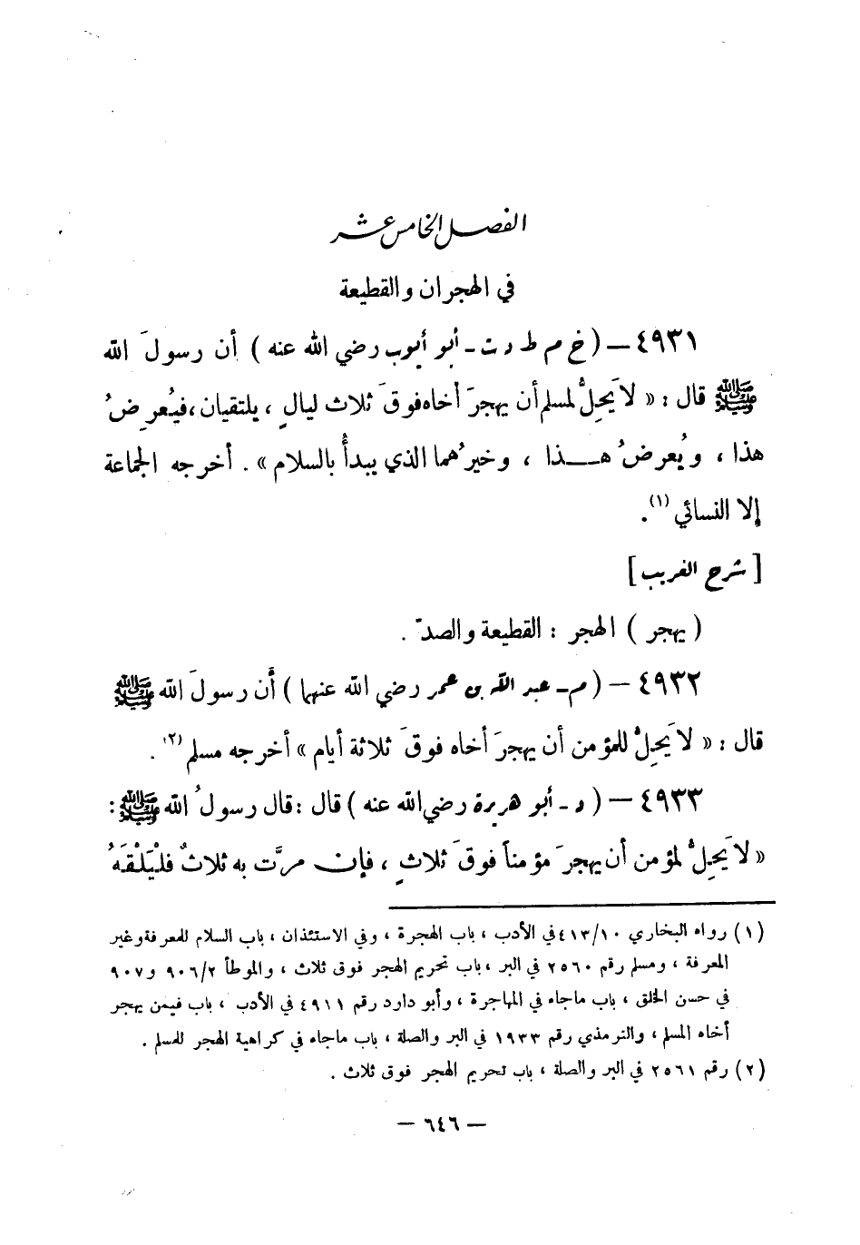 4932 - (م) عبد الله بن عمر - رضي الله عنهما -: أَنَّ رسولَ اللهِ - صلى الله عليه وسلم- قال: «لا يَحِلُّ للمؤمن أن يهجرَ أخاه فوقَ ثلاثة أيام» .
