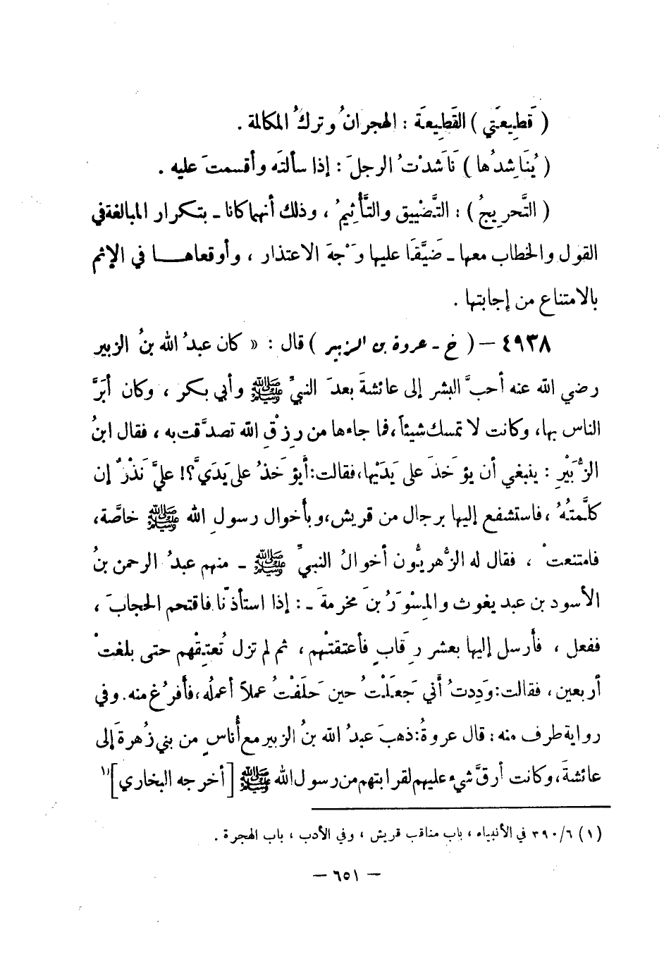 4938 - (خ) عروة بن الزبير: قال: «كان عبدُ الله بنُ الزبير - رضي الله عنه - أحبَ البشر إِلى عائشةَ بعدَ النبيِّ - صلى الله عليه وسلم- وأبي بكر، وكان أَبَرَّ الناس بها، وكانت لا تُمسِكُ شيئاً، فما جاءها من رِزْقِ الله تصدَّقت به، فقال ابنُ الزُّبَيْرِ: يَنبغي أن يُؤخَذَ على يَدَيْها، فقالت: أَيؤخَذُ على يَدَيَّ؟ عليَّ نَذْر إِن كَلَّمتُهُ، فاستشفع إِليها برجال من قريش، وبأَخوال رسولِ الله - صلى الله عليه وسلم- خاصَّة، فامتنعتْ، فقال له الزُّهريُّون أخوالُ النبيِّ - صلى الله عليه وسلم- منهم عبدُ الرحمن بنُ الأسود بن عبد يغوث والمِسْوَرُ بنَ مخرمةَ -: إِذا استأذّنا فاقتحم الحجابَ، ففعل، فأَرسل إِليها بعشرَ رِقَاب فأعتقتْهم، ثم لم تزل تُعتِقُهم حتى بلغتْ أربعين، فقالت: وَدِدتُ أَني جَعَلْتُ حينَ حَلَفْتُ عملاً أعملُه، فَأَفرُغ منه. وفي رواية طرف منه: قال عروةُ: ذهبَ عبدُ الله بنُ الزبير مع أُناس من بني زُهرةَ إِلى عائشةَ، وكانت أرقَّ شيء عليهم لقرابتهم من رسولِ الله - صلى الله عليه وسلم-» . [أخرجه البخاري] (¬1) . -[652]-