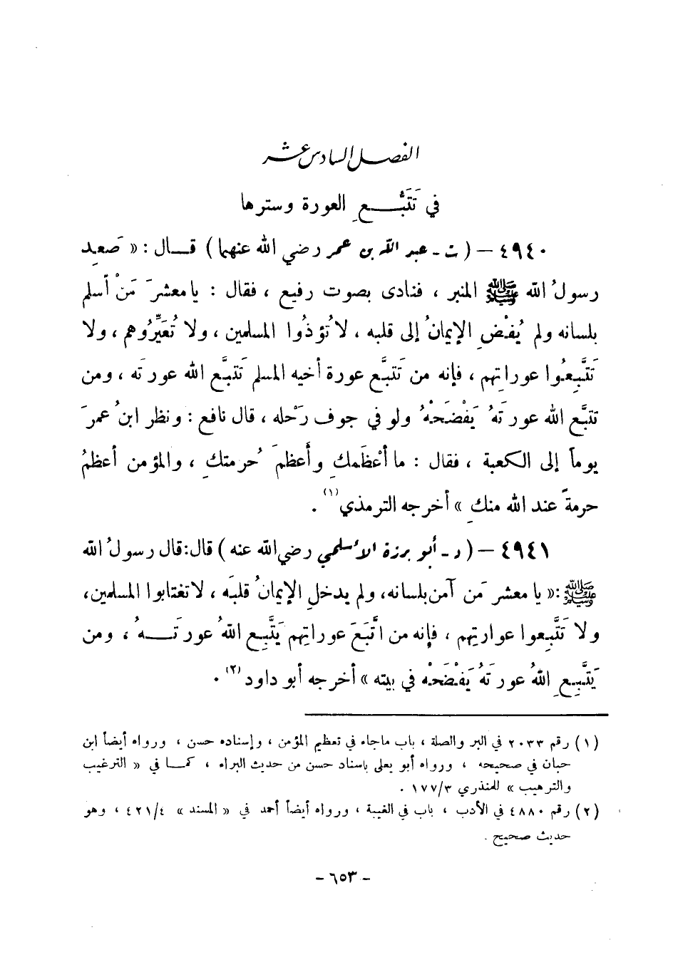 4940 - (ت) عبد الله بن عمر - رضي الله عنهما -: قال: «صَعِد رسولُ الله - صلى الله عليه وسلم- المنبر، فنادى بصوت رفيع، فقال: يا معشرَ مَنْ أسلم بلسانه، ولم يُفْضِ الإِيمانُ إِلى قلبه، لا تُؤذُوا المسلمين، ولا تُعَيِّرُوهم، ولا تَتَّبِعُوا عوراتِهم، فَإِنَّهُ من تَتبَّع عورة أخيه المسلم، تَتبَّع الله عورتَه، ومَن تتبَّع اللهُ عورَتَهُ يَفْضَحْهُ ولو في جوف رَحْلِهِ، قال نافع: ونظر ابنُ عمرَ يوماً إِلى الكعبة، فقال: ما أعْظَمكِ وأَعظمَ حُرمتكِ، والمؤمن أعظمُ حرمة عند الله منكِ» . أخرجه الترمذي (¬1) .