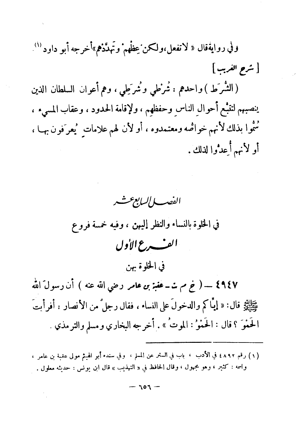 الفصل السابع عشر: في الخلوة بالنساء والنظر إليهن، وفيه خمسة فروع