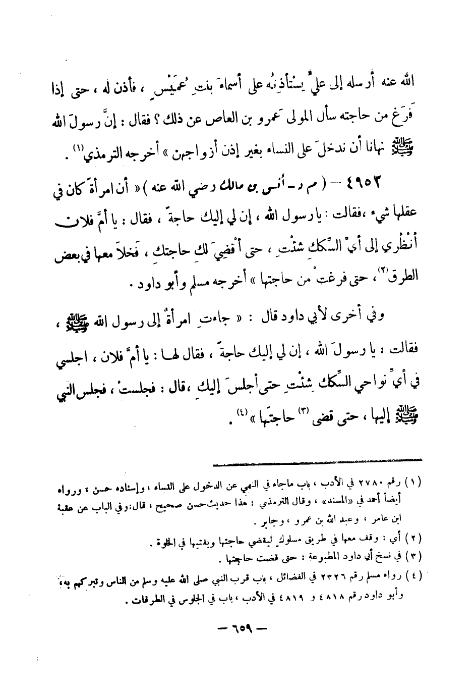 4952 - (م د) أنس بن مالك - رضي الله عنه -: «أن امرأة كان في عقلها شيء، فقالت: يا رسول الله، إِن لي إِليكَ حاجة، فقال: يا أمَّ فلان انْظُري إِلى أيِّ السِّككِ شِئْتِ، حتى أقْضِيَ لكِ حاجتكِ، فَخَلا مَعها في بعض الطرق (¬1) ، حتى فرغت من حَاجتها» . أخرجه مسلم، وأبو داود.