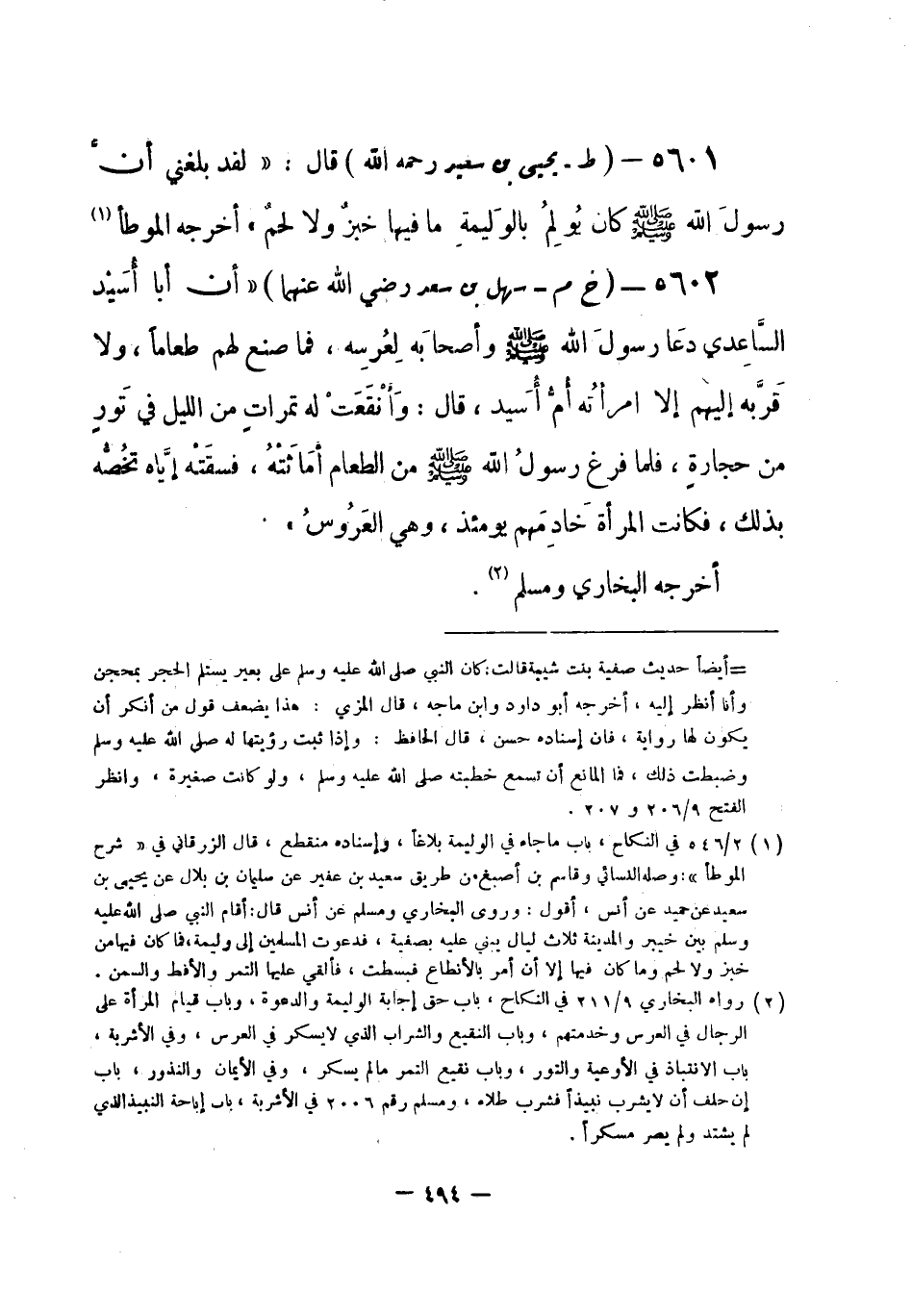 (¬1) 2 / 546 في النكاح، باب ما جاء في الوليمة بلاغاً، وإسناده منقطع، قال الزرقاني في " شرح الموطأ ": وصله النسائي وقاسم بن أصبغ من طريق سعيد بن عفير عن سليمان بن بلال عن يحيى بن سعيد عن حميد عن أنس، أقول: وروى البخاري ومسلم عن أنس قال: أقام النبي صلى الله عليه وسلم بين خيبر والمدينة ثلاث ليال يبني عليه بصفية، فدعوت المسلمين إلى وليمة، فما كان فيها من خبز ولا لحم وما كان فيها إلا أن أمر بالأنطاع فبسطت، فألقي عليها التمر والأقط والسمن.