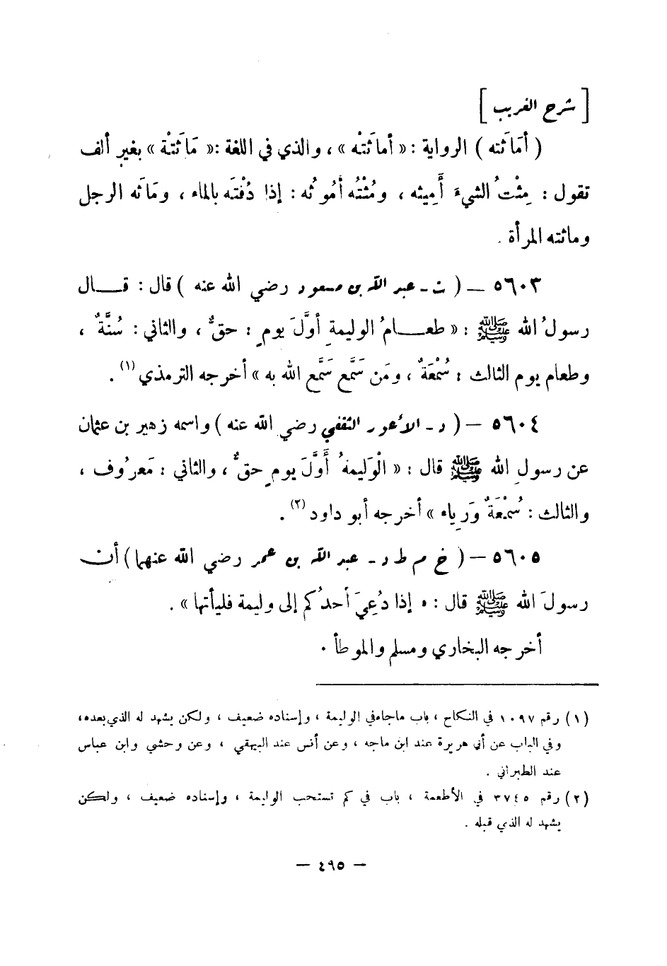 5605 - (خ م ط د) عبد الله بن عمر - رضي الله عنهما- أن رسول الله - صلى الله عليه وسلم- قال: «إذا دُعِيَ أحدُكم إلى وليمة فليأتها» . أخرجه البخاري ومسلم والموطأ. -[496]-