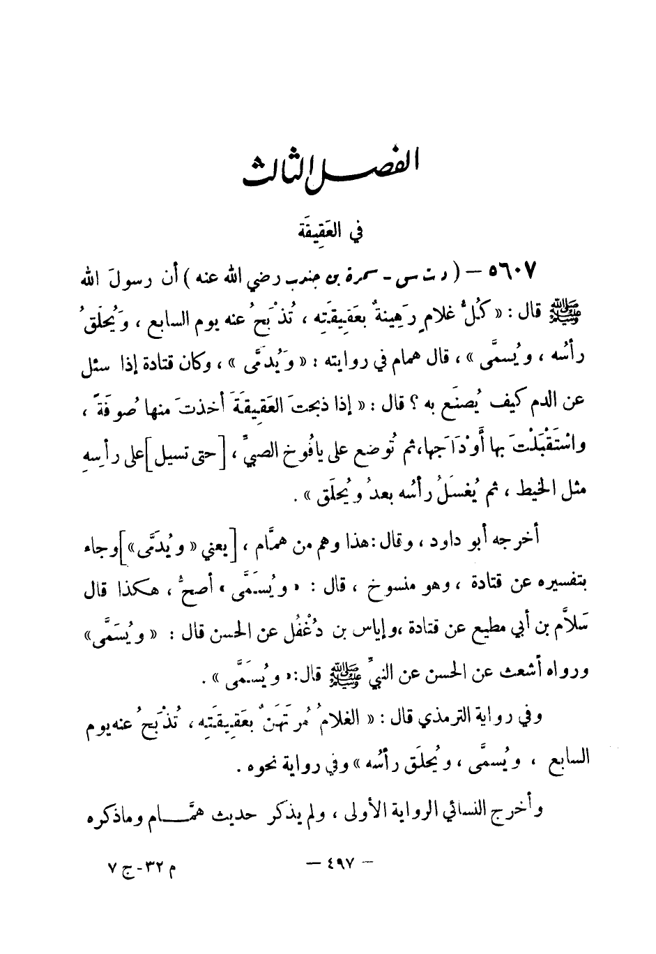 (¬1) رواه أبو داود رقم (2837) و (2838) في الأضاحي، باب في العقيقة، والترمذي رقم (1552) في الأضاحي، باب ما جاء في العقيقة، والنسائي 7 / 166 في العقيقة، باب متى يعق، من حديث الحسن عن سمرة، وإسناده صحيح، فقد صرح النسائي بسماع الحسن حديث العقيقة من سمرة، وقال الترمذي: هذا حديث حسن صحيح، قال: والعمل على هذا عند أهل العلم، يستحبون أن تذبح عن الغلام العقيقة يوم السابع، فإن لم يتهيأ يوم السابع فيوم الرابع عشر، فإن لم يتهيأ عق عنه يوم إحدى وعشرين، وانظر الحديث رقم (5609) في سماع الحسن من سمرة حديث العقيقة.