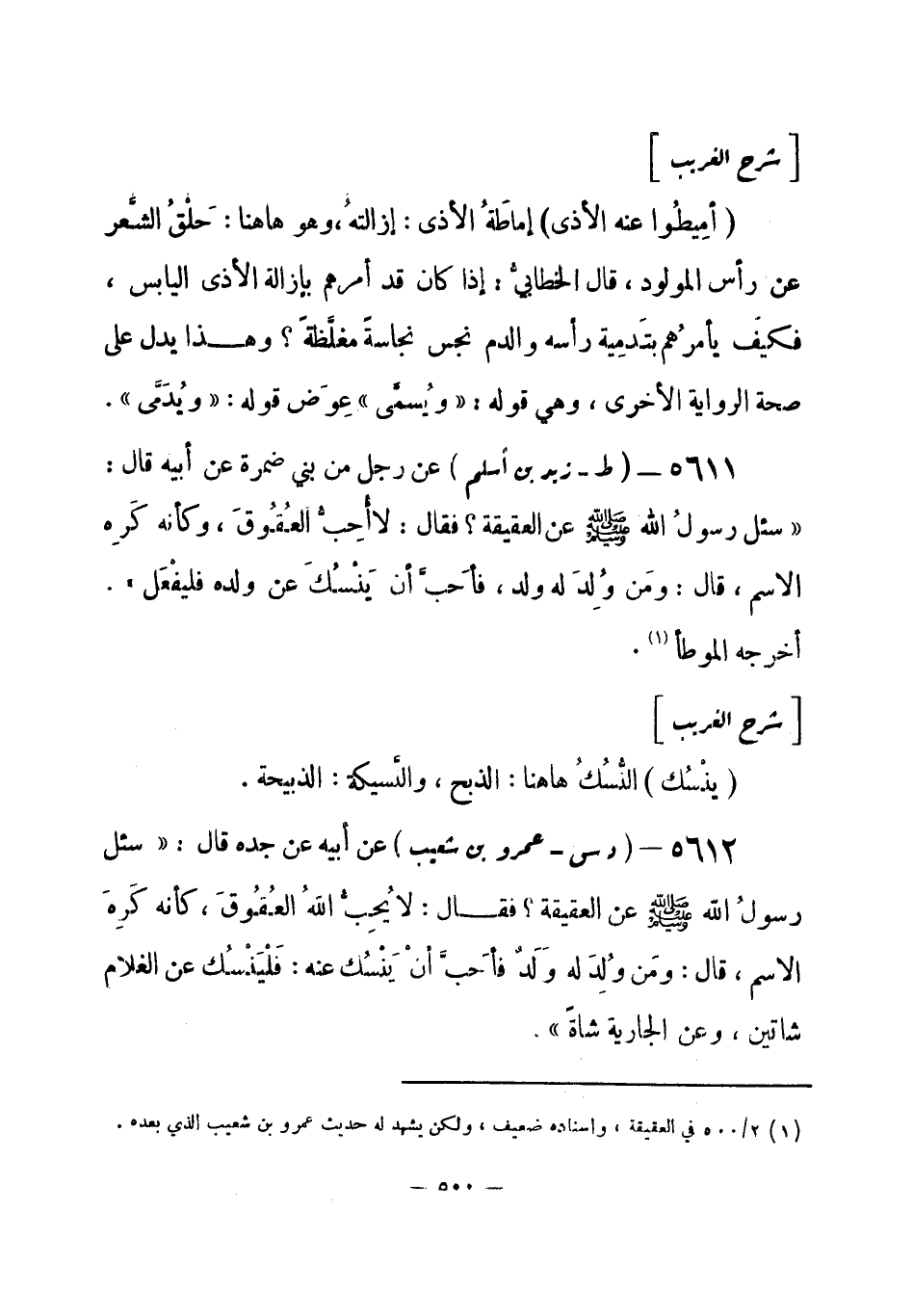 5612 - (د س) عمرو بن شعيب - عن أبيه عن جده قال: «سئل رسول الله - صلى الله عليه وسلم- عن العقيقة؟ فقال: لا يحبُّ الله العُقُوقَ، كأنه كَرِهَ الاسم، قال: ومَن وُلِدَ له وَلَد فأحَبَّ أنْ يَنسُك عنه: فَليَنسُك عن الغلام شاتين، وعن الجارية شاة» . -[501]- أخرجه النسائي (¬1) وزاد أبو داود (¬2) زيادة تجيء في الفصل الرابع الذي يلي هذا.