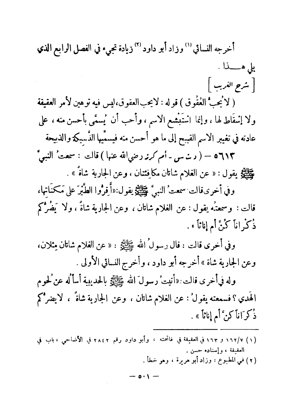 5613 - (د ت س) أم كرز - رضي الله عنها - قالت: سمعتُ النبيَّ - صلى الله عليه وسلم- يقول: «عن الغلام شاتان مكافِئتان، وعن الجارية شاةَ» .