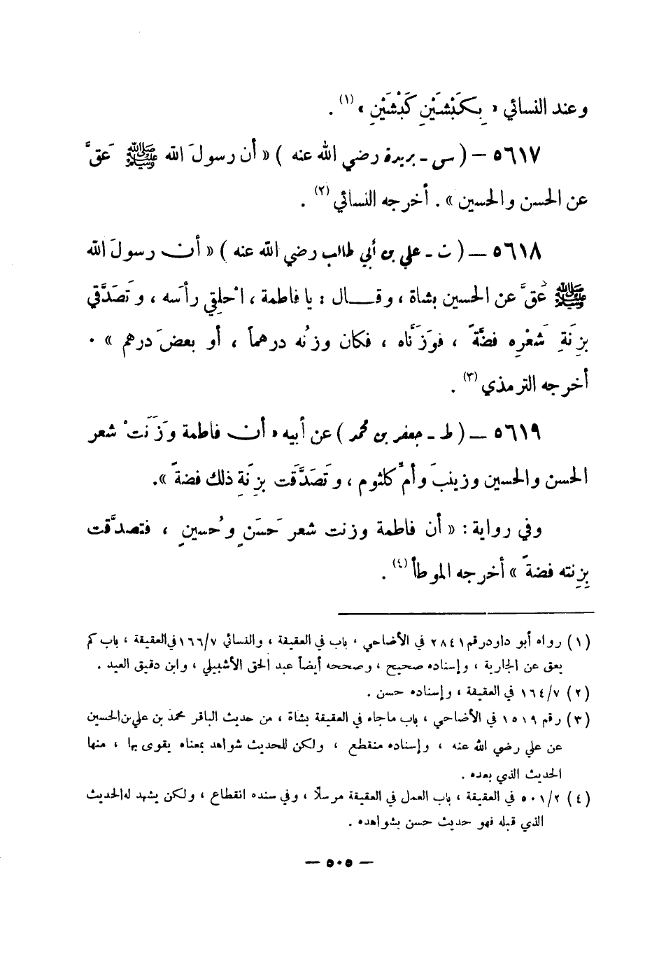 5618 - (ت) علي بن أبي طالب - رضي الله عنه - «أن رسول الله - صلى الله عليه وسلم- عَقَّ عن الحسين بشاة، وقال: يا فاطمة، احْلِقي رأسَه، وتَصَدَّقي بِزِنَةِ شَعْرِه فضَّة، فوَزَنَّاه، فكان وزنُه درهماً، أو بعضَ درهم» . أخرجه الترمذي (¬1) .