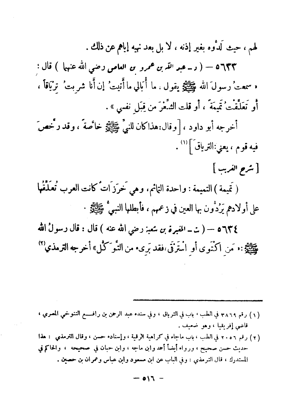 (¬1) رقم (2056) في الطب، باب ما جاء في كراهية الرقية، وإسناده حسن، وقال الترمذي: هذا حديث حسن صحيح، ورواه أيضاً أحمد وابن ماجة، وابن حبان في " صحيحه "، والحاكم في " المستدرك "، قال الترمذي: وفي الباب عن ابن مسعود وابن عباس وعمران بن حصين.