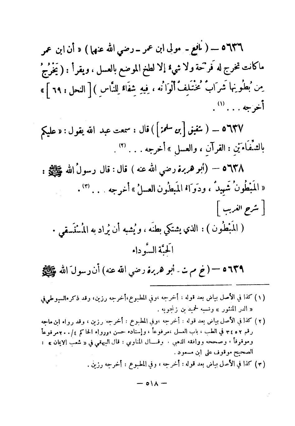 5638 - () أبو هريرة - رضي الله عنه - قال: قال رسول الله - صلى الله عليه وسلم-: «المَبْطُونُ شَهِيد، ودَوَاءُ المَبطُون العسلُ» أخرجه ... (¬1) .