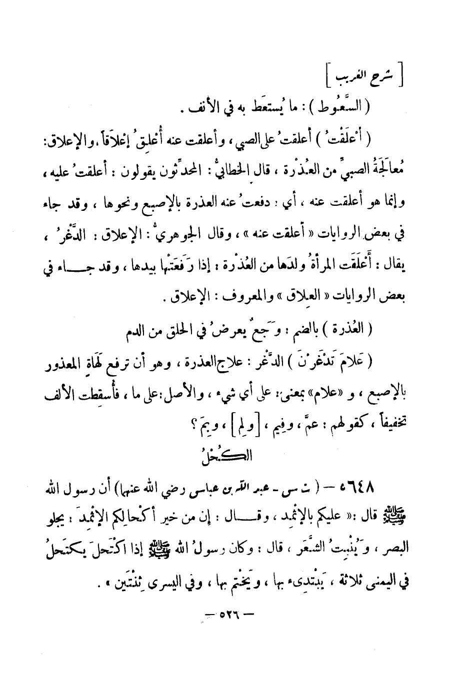 5648 - (ت س) عبد الله بن عباس - رضي الله عنهما - أن رسول الله - صلى الله عليه وسلم- قال: «عليكم بالإثْمِد، وقال: إن من خير أكْحالِكم الإثْمِدَ: يجلو البصر، ويُنْبِتُ الشَّعَر، قال: وكان رسول الله - صلى الله عليه وسلم- إذا اكْتَحَلَ يكتَحلُ في اليمنى ثلاثة، يَبْتدِئ بها، ويَخْتِم بها، وفي اليسرى ثِنْتَين» . -[527]-