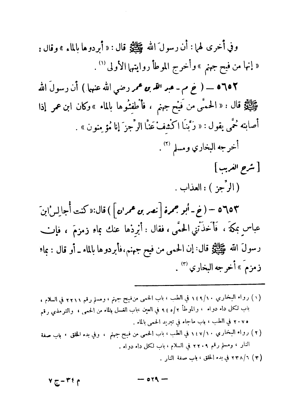 5652 - (خ م) عبد الله بن عمر - رضي الله عنهما - أن رسول الله - صلى الله عليه وسلم- قال: «الحمَّى من فَيْح جهنم، فأطْفِئُوها بالماء» وكان ابن عمر إذا أصابته حُمَّى يقول: «رَبَّنَا اكْشِفْ عَنَّا الرِّجزَ إنا مؤمنون» . أخرجه البخاري ومسلم (¬1) .
