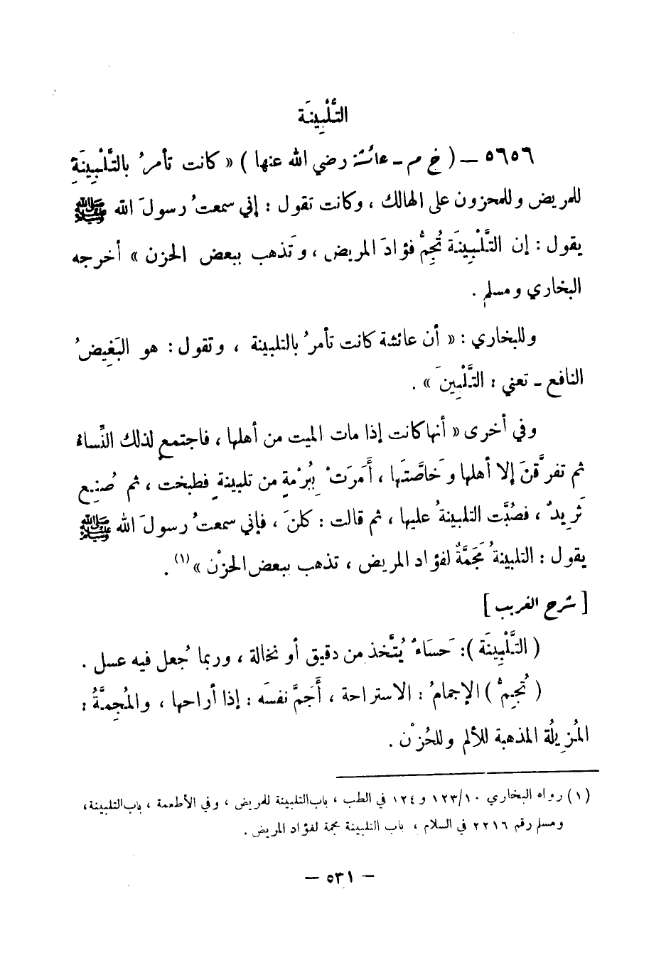 (¬1) رواه البخاري 10 / 123 و 124 في الطب، باب التلبينة للمريض، وفي الأطعمة، باب التلبينة، ومسلم رقم (2216) في السلام، باب التلبينة مجمة لفؤاد المريض.