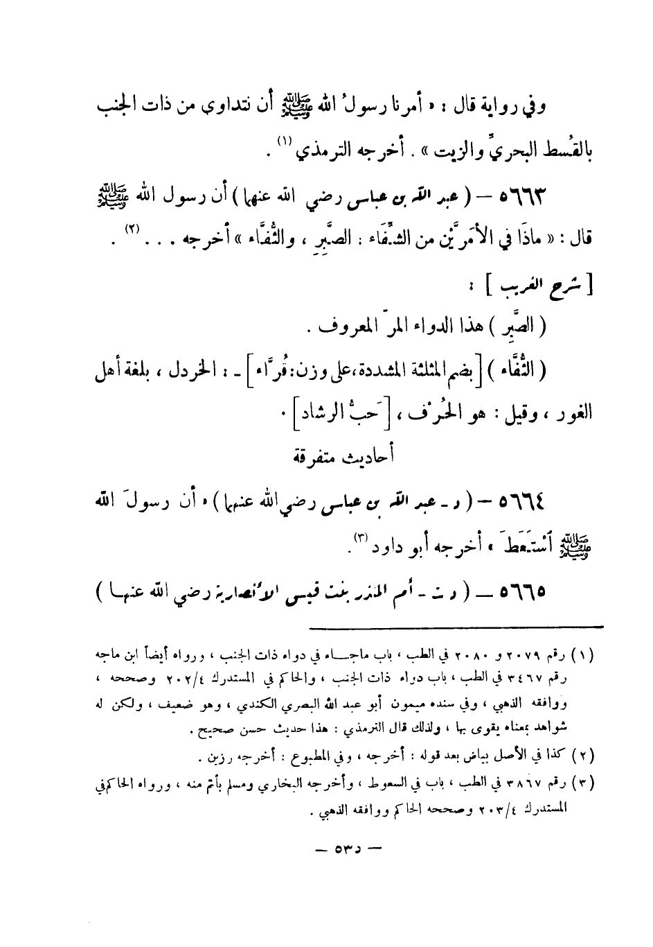 5663 - () عبد الله بن عباس - رضي الله عنهما - أن رسول الله - صلى الله عليه وسلم- قال: «ماذا في الأمَرَّيْن من الشِّفَاءِ: الصَّبِرِ، والثُّفَّاء» أخرجه ... (¬1) .