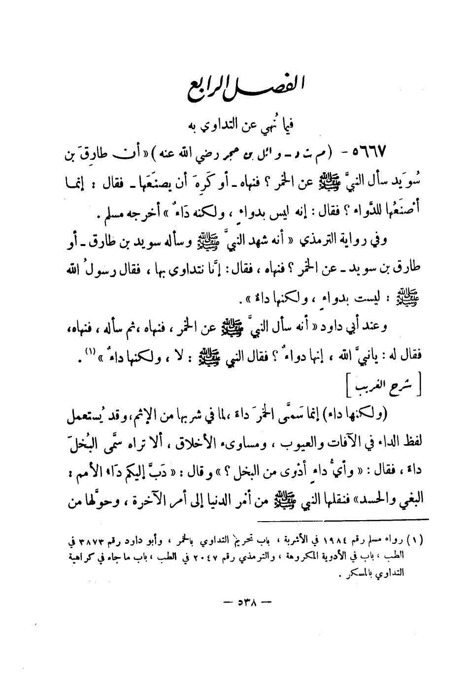 5667 - (م ت د) وائل بن حجر - رضي الله عنه -: «أن طارِقَ بن سُوَيد سأل النبيَّ - صلى الله عليه وسلم- عن الخمر؟ فنهاه - أو كَرِهَ أن يصنَعَها - فقال: إنما أصْنَعُها للدَّواء؟ فقال: إنه ليس بدواء، ولكنه داء» أخرجه مسلم.
