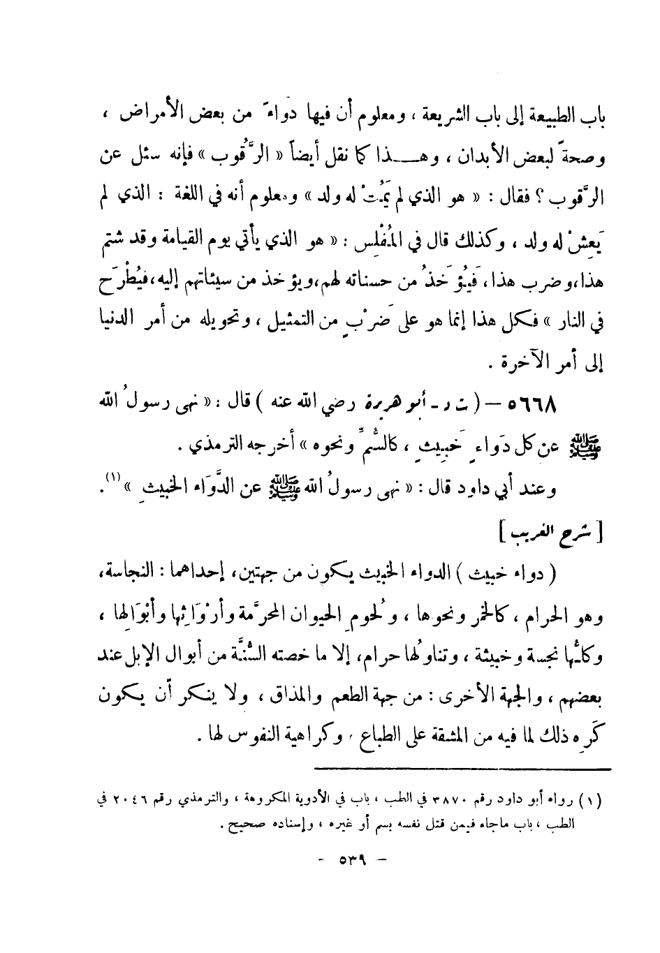 5668 - (ت د) أبو هريرة - رضي الله عنه - قال: «نهى رسول الله - صلى الله عليه وسلم- عن كل دَواء خبيث، كالسُّمِّ ونحوه» أخرجه الترمذي.