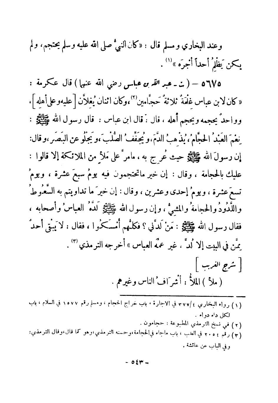 5675 - (ت) عبد الله بن عباس - رضي الله عنهما - قال عكرمة: «كان لابن عباس غِلْمَة ثلاثة حَجَّامين (¬1) ، وكان اثنان يُغِلاَّن [عليه وعلى أهله] ، وواحد يحجمه ويحجم أهله، قال: قال ابن عباس: قال رسول الله - صلى الله عليه وسلم-: «نِعْمَ العبد الحجَّامُ، يُذْهِبُ الدَّمَ، ويُجَفِّفُ الصُّلْبَ، ويَجْلو عن البَصَر» وقال: إن رسول الله - صلى الله عليه وسلم- حيث عُرِج به، ما مرَّ على مَلأ من الملائِكَةِ إلا قالوا: عليك بالحجامة، وقال: إن خير ما تحتجمون فيه يومُ سبعَ عشرة، ويومُ تسعَ عشرة، ويومُ إحدى وعشرين، وقال: إن خير ما تداويتم به السَّعُوطُ واللَّدُودُ، الحجامةُ والمشِيُّ، وإن رسول الله - صلى الله عليه وسلم- لَدَّه العباسُ وأصحابه، فقال رسول الله - صلى الله عليه وسلم-: «مَنْ لَدَّني؟ فكلُّهم أمْسَكُوا، فقال: لا يَبْقى أحد مِمَّن في البيت إلا لُدَّ، غير عمِّه العباس» أخرجه الترمذي (¬2) .