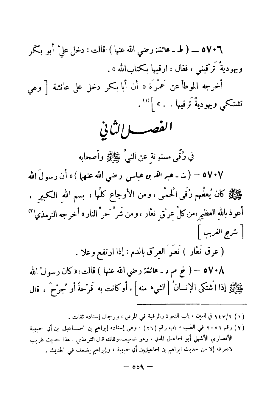 5707 - (ت) عبد الله بن عباس - رضي الله عنهما -: «أن رسول الله - صلى الله عليه وسلم- كان يُعلِّمهم رُقَى الحُمَّى، ومن الأوجاع كلِّها: بسم اللهِ الكبيرِ، أعوذ باللهِ العظيمِ، من كلِّ عِرْق نعَّار، ومن شَرِّ حَرِّ النار» أخرجه الترمذي (¬1) .