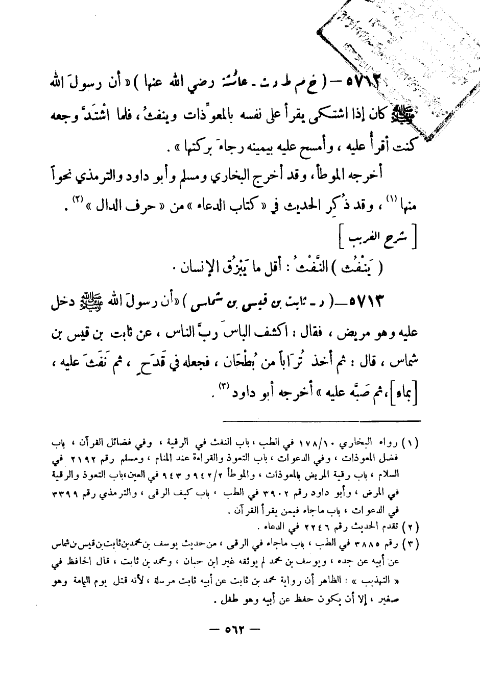 5712 - (خ م ط د ت) عائشة - رضي الله عنها - «أن رسول الله - صلى الله عليه وسلم- كان إذا اشتكى يقرأ على نفسه بالمعوِّذات وينفثُ، فلما اشْتَدَّ وجعه كنت أقرأ عليه، وأمسح عليه بيمينه رجاءَ بركتها» .
