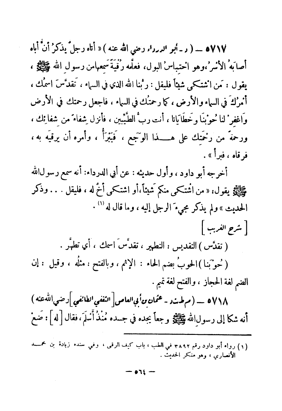 5717 - (د) أبو الدرداء - رضي الله عنه - «أتاه رجل يذكرُ أنَّ أباه أصابَهُ الأسْرُ، وهو احْتِباسُ البول، فعلَّمهُ رُقْيَة سَمِعها من رسول الله - صلى الله عليه وسلم-، يقول: «مَنِ اشْتكى شيئاً فليقل: ربُّنا الله الذي في السماء، تَقدَّسَ اسمُك، أمْرُك في السماء والأرض، كما رحمتُك في السماء، فاجعل رحمتك في الأرض واغفِرْ لنا حُوبَنا وخَطَايَانا، أنت ربُّ الطَّيِّبين، فأنزل شِفاء من شِفائِك، ورحمة من رحْمَتِك على هذا الوَجَعِ، فَيَبْرَأ، وأمره أن يرقيه به، فرقاه، فبرأ» .