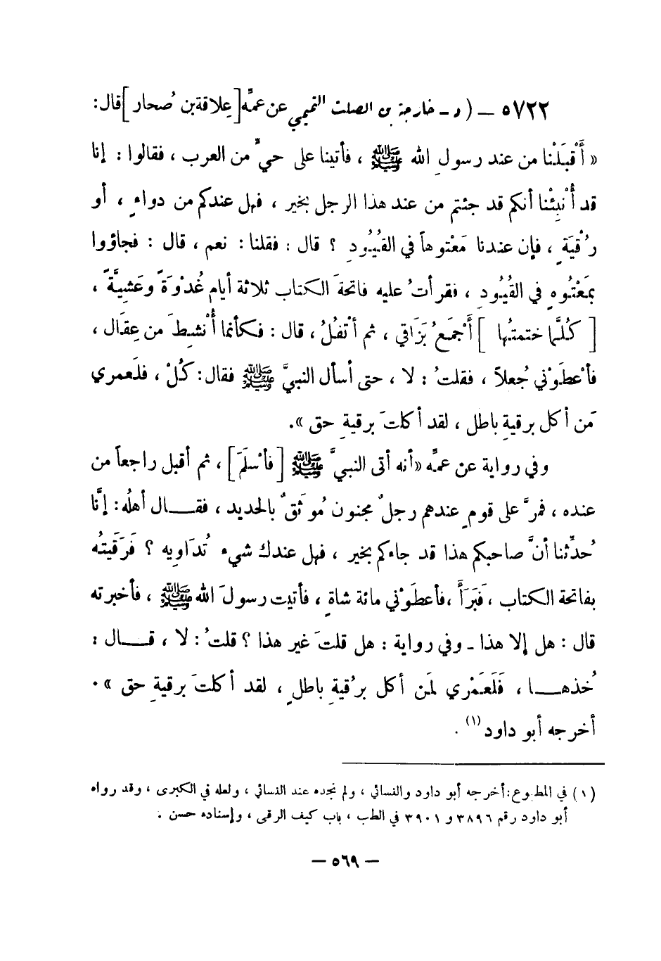 5722 - (د) خارجة بن الصلت التميمي عن عمِّه [عِلاقة بن صُحار] قال: «أقْبَلْنا من عند رسول الله - صلى الله عليه وسلم-، فأتينا على حيّ من العرب، فقالوا: إنا قد أُنْبِئْنا أنكم قد جئتم من عند هذا الرجل بخير، فهل عندكم من دواء، أو رُقْيَة، فإن عندنا مَعْتوهاً في القُيُودِ؟ قال: فقلنا: نعم، قال: فجاؤوا بمَعْتُوه في القُيُودِ، فقرأتُ عليه فاتحةَ الكتاب ثلاثة أيام غُدْوَة وعَشِيَّة، [كُلَّما ختمتُها] أجْمَعُ بَزَاقي، ثم أتْفُلُ، قال: فكأنما أُنشطَ من عِقَال، فأعْطَوْني جُعلاً، فقلتُ: لا، حتى أسأل النبيَّ - صلى الله عليه وسلم- فقال: كُلْ، فلَعمري مَن أكل برقية باطل، لقد أكلت برقية حق» .