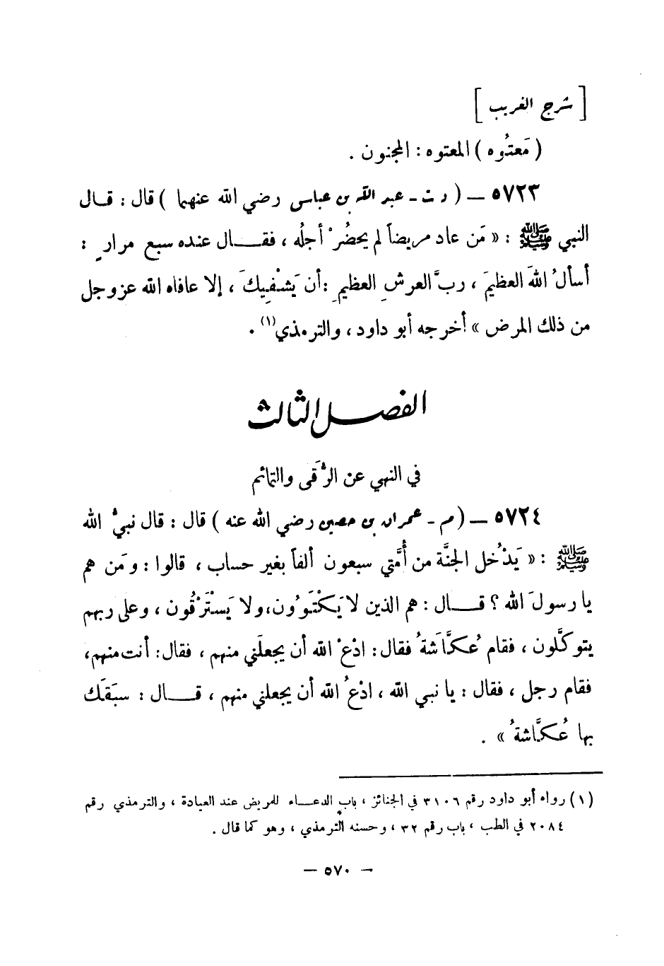 5724 - (م) عمران بن حصين - رضي الله عنه - قال: قال نبيُّ الله - صلى الله عليه وسلم-: «يَدْخُل الجنَّة من أُمَّتِي سبعون ألفاً بغير حساب، قالوا: ومَن هم يا رسول الله؟ قال: هم الذي لا يَكْتَوُون، ولا يَسْتَرْقُون، وعلى ربهم يتوكَّلون، فقام عُكَّاشَة فقال: ادْعُ الله أن يجعلني منهم. فقال: أنت منهم. فقام رجل، فقال: يا نبي الله، ادْعُ الله أن يجعلني منهم، قال: سَبَقَك بها عُكَّاشَة» . -[571]-