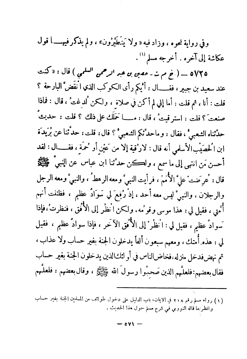 (¬1) قال الحافظ في " الفتح ": وقد أنكر الشيخ تقي الدين بن تيمية هذه الرواية (يعني التي فيها لفظة: يرقون) وزعم أنها غلط من راويها ... ، وانظر " الفتح " 11 / 354 في الرقاق، باب يدخل الجنة سبعون ألفاً بغير حساب.