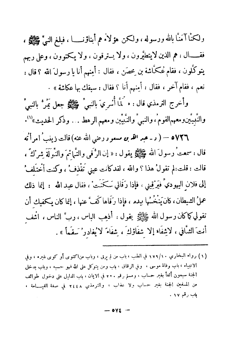 5726 - (د) عبد الله بن مسعود - رضي الله عنه - قالت زينبُ امرأتُه قال: سمعتُ رسول الله - صلى الله عليه وسلم- يقول: «إن الرُّقَى والتَّمَائِمَ والتِّوَلَةَ شِرْك، قالت: قلت: لم تقولُ هذا؟ والله، لقد كانت عيني تَقْذِفُ، وكنت أخْتَلِفُ إلى فلان اليهوديِّ فيَرْقِيني، فإذا رَقَاني سَكَنَتْ، فقال عبد الله: إنما ذلك عملُ الشيطان، كان يَنْخُسُها بيده، فإذا رَقَاها كَفَّ عنها، إنما كان يكفيك أن تقولي كما كان رسول الله - صلى الله عليه وسلم- يقول: أذهِب الباس، ربَّ الناس، اشْفِ أنتَ الشافي، لا شِفَاءَ إلا شِفَاؤكَ، شِفَاء لا يُغادِرُ سَقَماً» . -[575]- أخرجه أبو داود (¬1) .