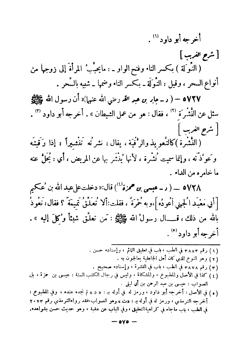 5727 - (د) جابر بن عبد الله - رضي الله عنهما - أن «رسول الله - صلى الله عليه وسلم- سئل عن النُّشْرَةِ (¬1) ، فقال: هو من عمل الشيطان» أخرجه أبو داود (¬2) .