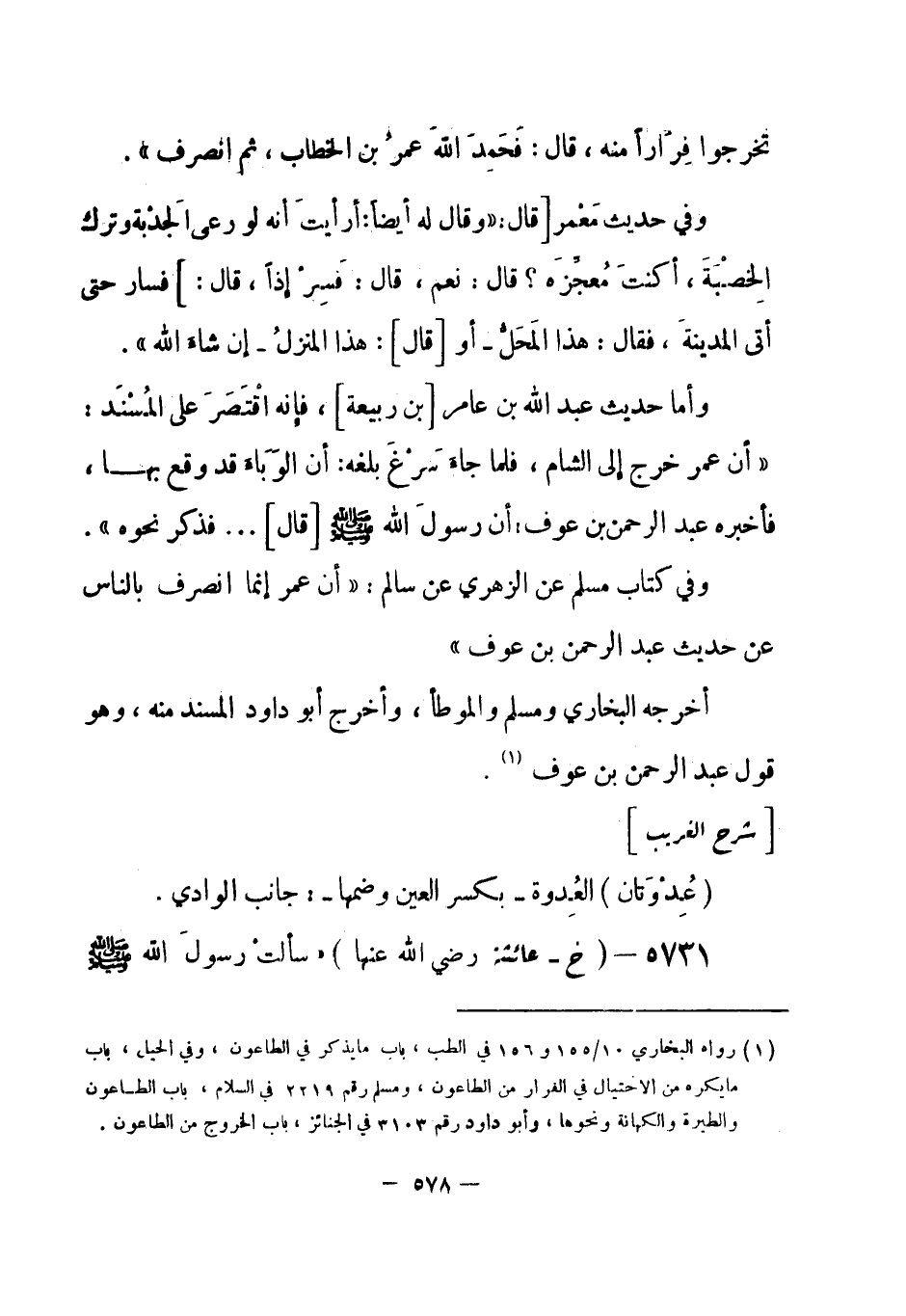 5731 - (خ) عائشة - رضي الله عنها - «سألتْ رسول الله - صلى الله عليه وسلم -[579]- عن الطاعون؟ فقال: كان عذاباً يَبعثُه الله على مَن كان قبلكم، فجعله الله رحمة للمؤمنين، ما مِن عبد يكون في بلد يكون فيه، فيمكث [فيه] لا يخرج [من البلد] ، صابراً مُحْتَسباً، يعلم أنه لاُ يصيِبُه إلا ما كتب الله له، إلا كان له مثْلُُ أجرِ شهيد» أخرجه البخاري (¬1) .