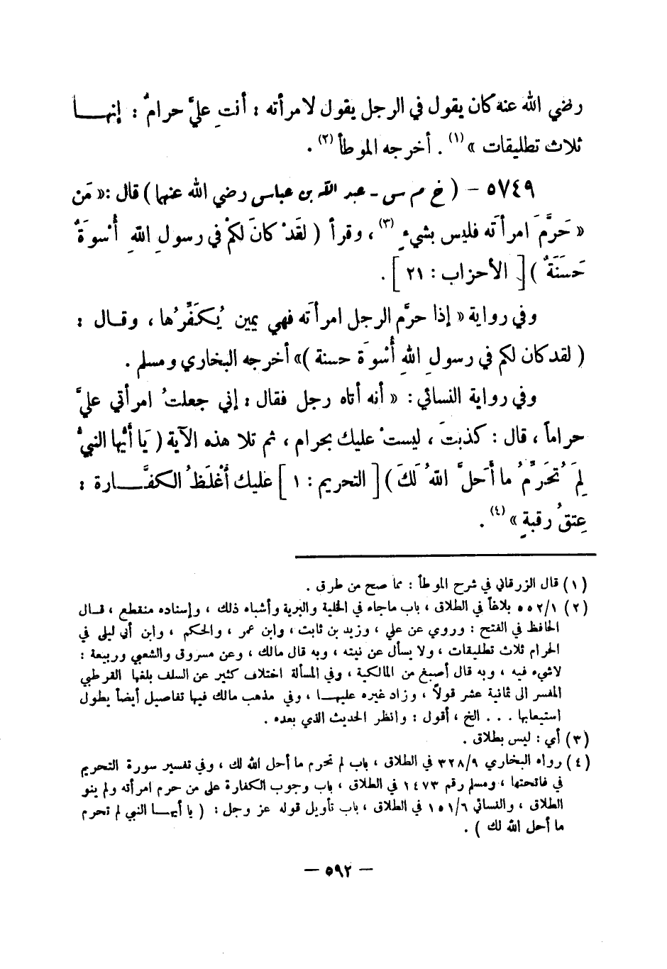 5749 - (خ م س) عبد الله بن عباس - رضي الله عنهما - قال: «مَن حَرَّمَ امرأتَه فليس بشيء (¬1) ، وقرأ {لَقَدْ كانَ لكمْ في رسولِ اللهِ أُسْوَةٌ حَسَنَةٌ} [الأحزاب: 21] » .