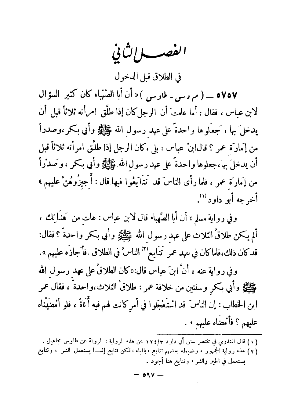 5757 - (م د س) طاوس - «أن أبا الصَّهْباءِ كان كثير السؤال لابن عباس، فقال: أما علمتَ أن الرجل كان إذا طلَّق امرأته ثلاثاً قبل أن يدخلَ بهَا، جَعَلوها واحدة على عهدِ رسول الله - صلى الله عليه وسلم- وأبي بكر، وصدراً من إمَارَة عمر؟ قال ابنُ عباس: بلى، كان الرجل إذا طلَّق امرأته ثلاثاً قبل أن يدخلَ بها، جعلوها واحدة عهد رسول الله - صلى الله عليه وسلم- وأبي بكر، وصَدْراً من إمَارَة عمر، فلما رأى الناسَ قد تَتَايعُوا فيها قال: أَجِيزُوهنَّ عليهم» أخرجه أبو داود (¬1) .