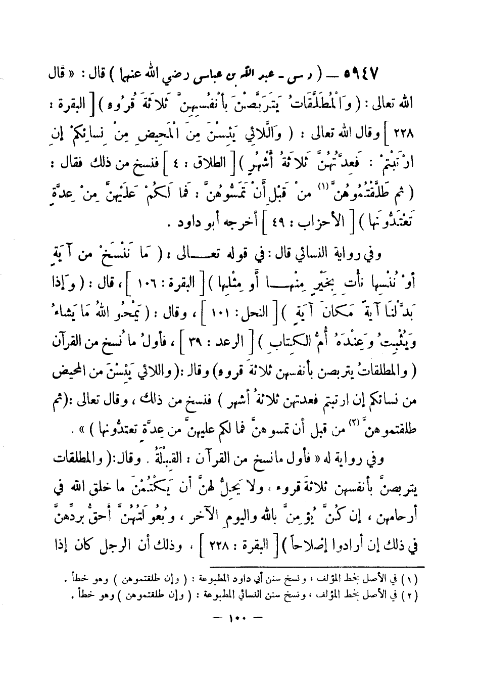 5947 - (د س) عبد الله بن عباس - رضي الله عنهما - قال: قال الله تعالى: {وَالْمُطَلَّقَاتُ يَتَرَبَّصْنَ بأنْفُسِهِنَّ ثَلاثَةَ قُرُوءٍ} [البقرة: 228] ، وقال الله تعالى: {وَالَّلائِي يَئِسْنَ مِنَ المَحِيضِ مِنْ نِّسائِكُمْ إِنِ ارْتَبْتُمْ فَعِدَّتُهُنَّ ثَلاثَةُ أَشْهُرٍ} [الطلاق: 4] ، فنسخ من ذلك فقال: {ثُمَّ طَلَّقْتُمُوهُنَّ (¬1) مِنْ قَبْلِ أَنْ تَمَسُّوهُنَّ فَمَا لَكُمْ عَلَيْهِنَّ مِنْ عِدَّةٍ تَعْتَدُّونَها} [الأحزاب: 49] . أخرجه أبو داود.