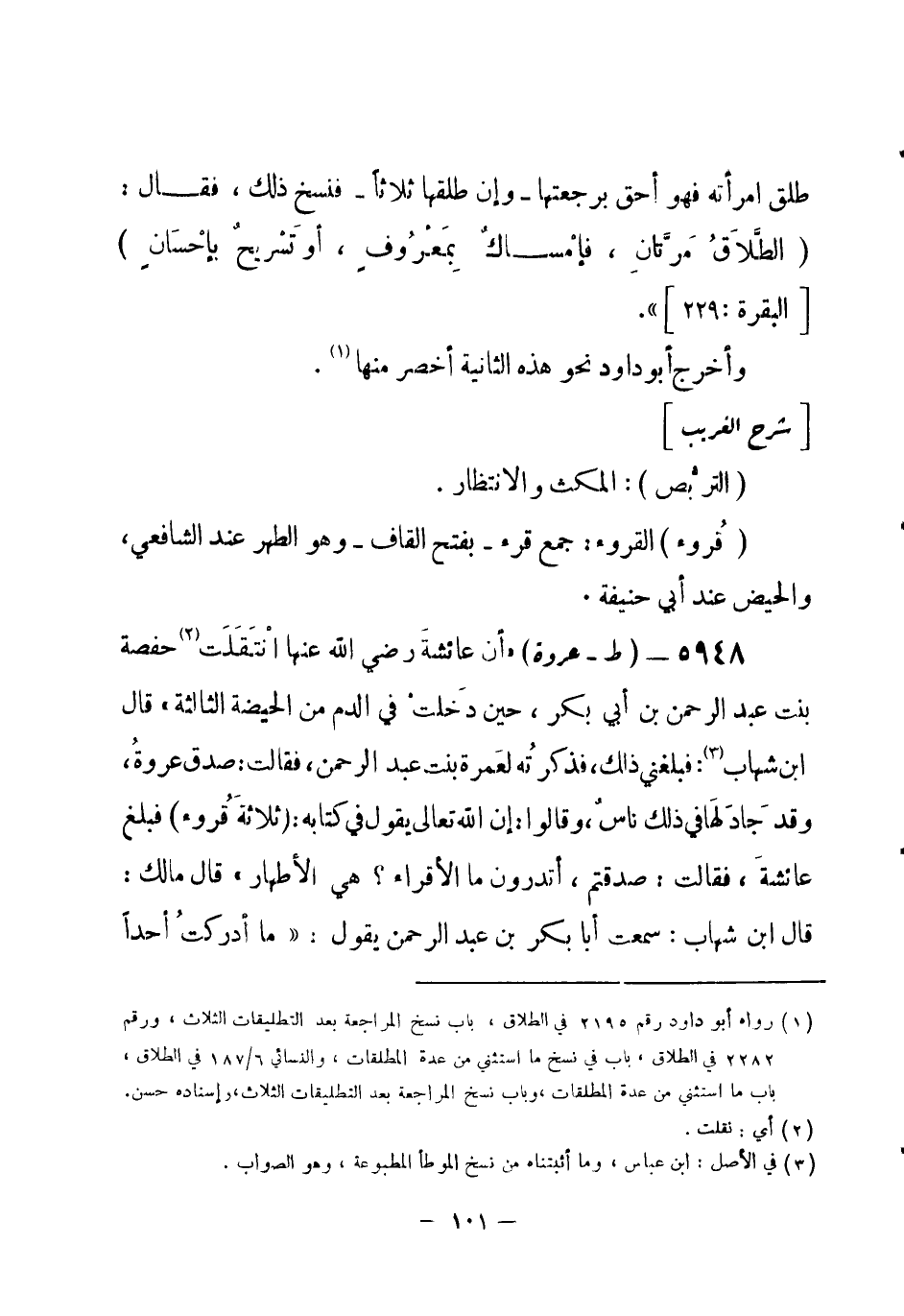 5948 - (ط) عروة «أن عائشةَ - رضي الله عنها - انْتَقَلَت (¬1) حفصة بنت عبد الرحمن بن أبي بكر، حين دَخلتْ في الدم من الحيضة الثالثة» قال ابن شهاب (¬2) : فبلغني ذلك، فذكرتُه لعَمرة بنت عبد الرحمن، فقالت: صدق عروةُ، وقد جَادَلَهَا في ذلك ناس، وقالوا: إن الله تعالى يقول في كتابه: {ثلاثةََ قُروء} فبلغ عائشةَ، فقالت: صدقتم، أتدرون ما الأقراء؟ هي الأطهار.
