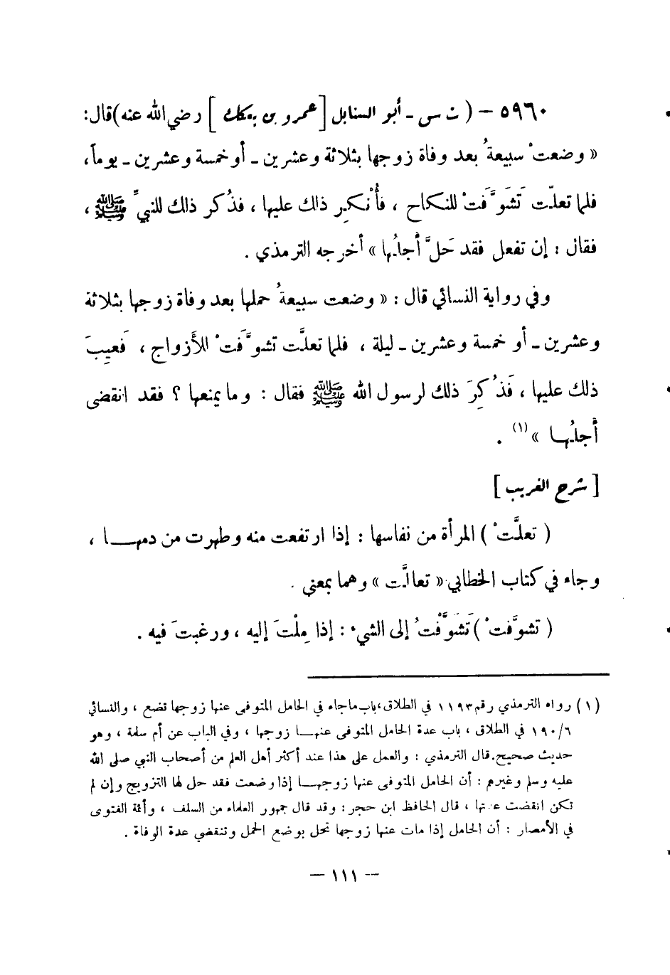 5960 - (ت س) أبو السنابل [عمرو بن بعكك]- رضي الله عنه - قال: «وضعتْ سبيعةُ بعد وفاة زوجها بثلاثة وعشرين - أو خمسة وعشرين - يوماً، فلما تعلّت تَشَوَّفَتْ للنكاح، فأُنْكِر ذلك عليها، فذُكر ذلك للنبيِّ - صلى الله عليه وسلم-، فقال: إِن تفعل فقد حَلَّ أَجلُها» . أخرجه الترمذي.