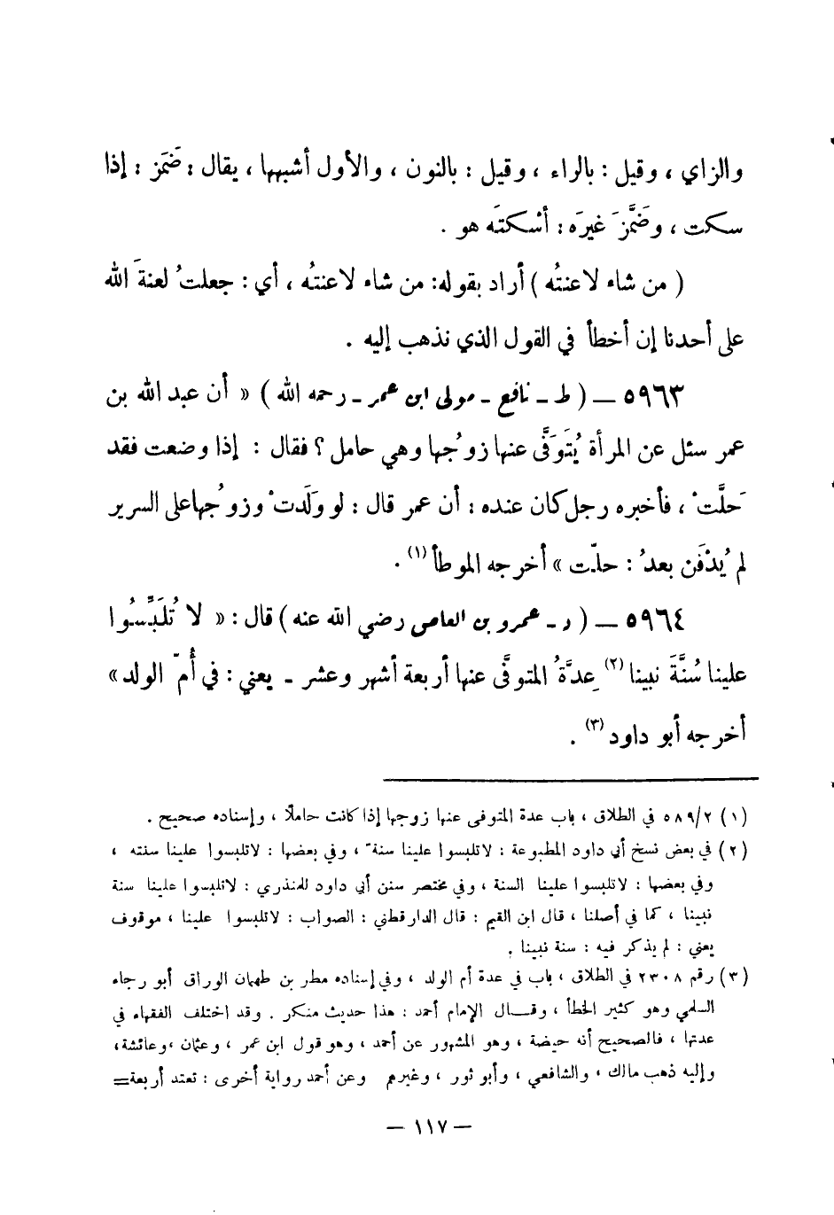 5964 - (د) عمرو بن العاص - رضي الله عنه - قال: «لا تُلَبِّسُوا علينا سُنَّةَ نبينا (¬1) عِدَّةُ المتوفَّى عنها أربعة أشهر وعشر - يعني: في أُمّ الولد» . أَخرجه أبو داود (¬2) . -[118]-