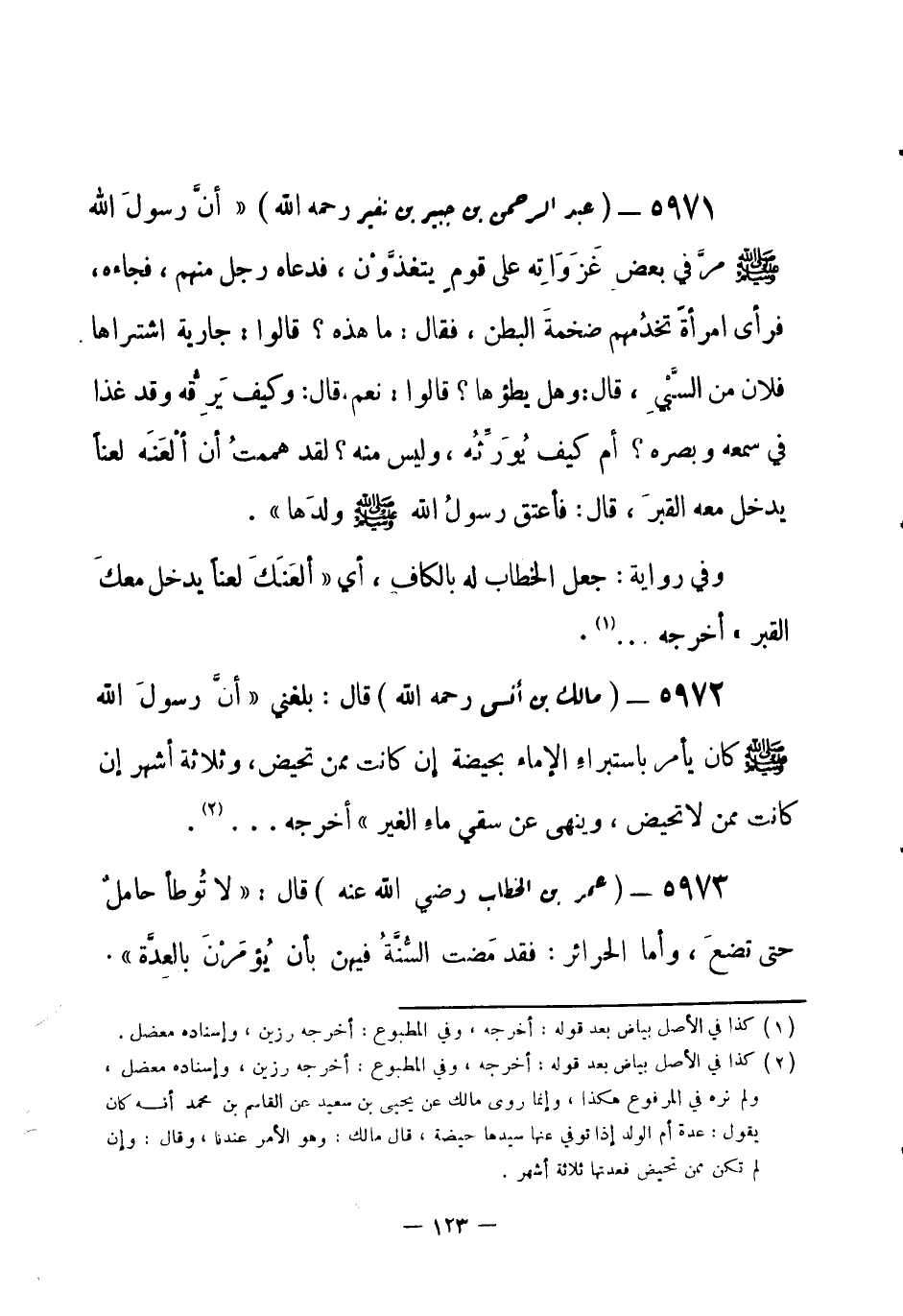 5971 - () عبد الرحمن بن جبير بن نفير - رحمه الله - «أنَّ رسولَ الله - صلى الله عليه وسلم- مَرَّ في بعضِ غَزَوَاتِه على قوم يَتغذَّوْن، فدعاه رجل منهم، فجاءه، فرأى امرأة تخدُمهم ضخمةَ البطن، فقال: ما هذه؟ قالوا: جارية اشتراها فلان من السَّبْي، قال: وهل يطؤها؟ قالوا: نعم، قال: وكيف يَرِقُّه وقد غذا في سمعه وبصره؟ أم كيف يُوَرِّثُه، وليس منه؟ لقد هممتُ أن أَلْعَنَه لعناً يدخل معه القبرَ، قال: فأعتق رسولُ الله - صلى الله عليه وسلم- ولدَها» .