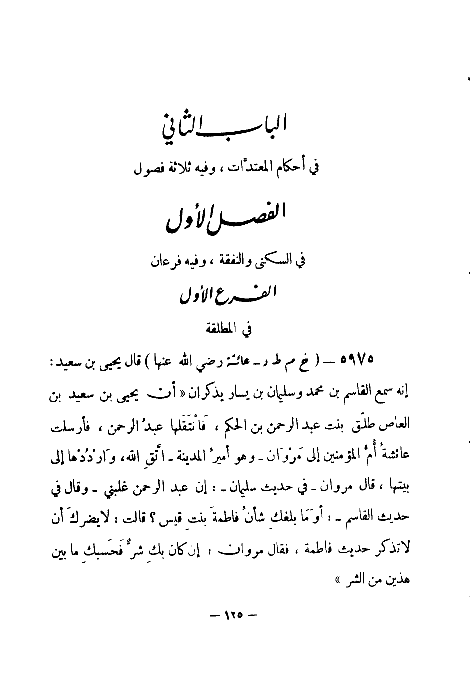 5975 - (خ م ط د) عائشة - رضي الله عنها - قال يحيى بن سعيد: إنه سمع القاسم بن محمد، وسليمان بن يسار يذكران: «أن يحيى بن سعيد بن العاص طلّق بنت عبد الرحمن بن الحكم، فَانْتَقَلها عبد الرحمن، فأرسلت عائشةُ أُمُّ المؤمنين إلى مَروَان - وهو أميرُ المدينة - اتَّقِ الله، وَارْدُدْها إلى بيتها، قال مروان - في حديث سليمان -: إن عبد الرحمن غلبني - وقال في حديث القاسم -: أوَمَا بَلغكِ شَأنُ فاطمةَ بنتِ قيس؟ قالت: لا يضرُّكَ أن لا تذكر حديث فاطمة، فقال مروان: إن كان بِكِ شرّ فَحَسبكِ ما بين هذين من الشر» . -[126]-