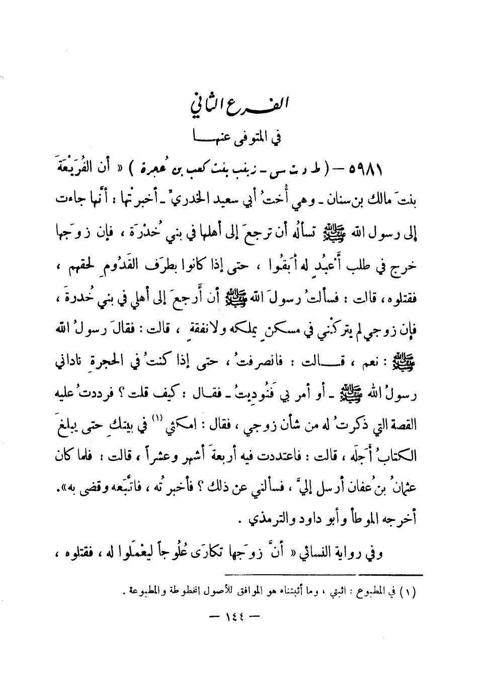 5981 - (ط د ت س) زينب بنت كعب بن عُجرة «أن الفُرَيعَةَ بنتَ مالك بن سنان - وهي أُختُ أبي سعيد الخدريِّ - أخبرتْها: أَنَّها جاءت إِلى رسولِ الله - صلى الله عليه وسلم- تسألُه أن ترجعَ إلى أهلها في بني خُدْرَة، فإن زوجَها خرج في طلب أَعْبُد له أَبَقُوا، حتى إذا كانوا بطرَف القَدُومِ لحقهم، فقتلوه، قالت: فسألتُ رسولَ الله - صلى الله عليه وسلم- أن أَرجعَ إلى أهلي في بني خُدرةَ، فإِن زوجي لم يتركني في مسكن يملكه ولا نفقة، قالت: فقالَ رسولُ الله - صلى الله عليه وسلم-: نعم، قالت: فانصرفتُ حتى إذا كنتُ في الحجرةِ ناداني رسولُ الله - صلى الله عليه وسلم- أو أمر بي فَنُودِيتُ - فقال: كيف قلت؟ فرددتُ عليه القصة التي ذكرتُ له من شأن زوجي، فقال: امكثي (¬1) في بيتِكِ حتى يبلغَ الكتابُ أَجَلَه، قالت: فاعتددت فيه أربعةَ أشهر وعشراً، قالت: فلما كان عثمانُ بنُ عفان، أرسلَ إليَّ، فسألني عن ذلك؟ فأخبرتُه، فاتَّبَعه وقضى به» . أخرجه الموطأ وأبو داود والترمذي.