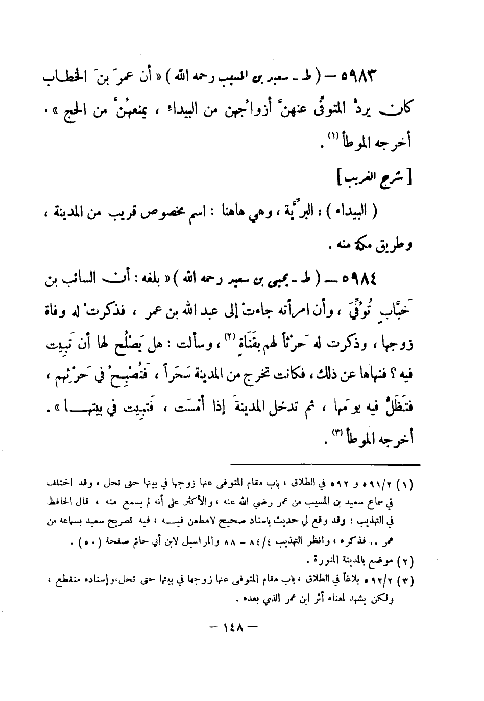5983 - (ط) سعيد بن المسيب - رحمه الله - «أن عمرَ بنَ الخطاب كان يردُّ المتوفَّى عنهنَّ أزواجُهن من البيداءِ، يمنعهُنَّ من الحج» . أخرجه الموطأ (¬1) .