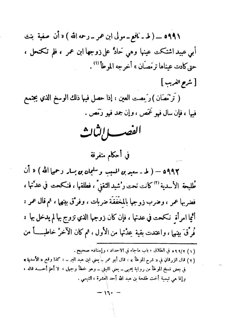 5991 - (ط) نافع مولى ابن عمر - رحمه الله - «أن صفية بنتَ أبي عبيد اشتكت عينها وهي حَادٌّ على زوجها ابن عمر، فلم تكتحل، حتى كادت عيناها ترَمصَان» أخرجه الموطأ (¬1) .